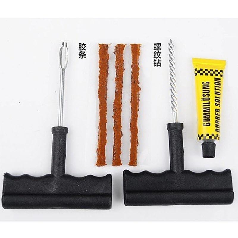Bộ sản phẩm Dụng Cụ Vá Lốp Không Săm gồm : 1 cây dùi, 1 cây gim, 1 chai keo 12ml và 3 sợi cao su non.