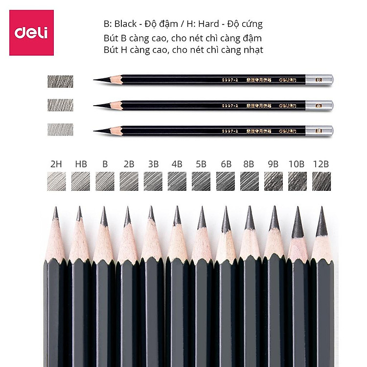 (Bút chì với chữ in đậm B càng lớn, màu càng đậm; chữ in đậm H càng lớn, độ cứng càng cao)