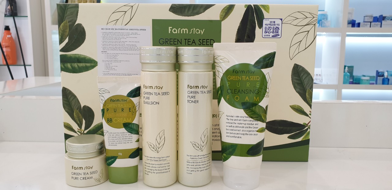 - Thiết kế chai công nghệ mới của hãng giúp sản phẩm ít tiếp xúc với không khí, không bị oxy hóa. Việc lấy sản phẩm đúng liều lượng cũng trở nên dễ dàng, vệ sinh hơn. Bộ 5 sản phẩm cơ bản: FARMSTAY GREENTEA SEED PURE FOAM CLEANING – 180ml (SRM) - Giúp làm sạch hoàn toàn mĩ phẩm còn lại trên mặt và các thành phần bã nhờn trên da để ngăn chặn các vấn đề về da, giúp da hoàn toàn sạch sẽ. - Giúp làn da khô ráp và mệt mỏi được bổ sung ẩm và luôn mềm mại. FARMSTAY GREENTEA SEED PURE TONER – 150ml (Nước hoa hồng) Chiết xuất hạt trà xanh, lá hồng, hoa nhài và lô hội. Giúp bổ sung độ ẩm cho làn da khô ráp. Giúp làm dịu da. Giúp tái tạo năng lượng cho da bằng cách làm bằng làn da đã bị mất sức sống bởi căng thẳng và ô nhiễm bên ngoài. FARMSTAY GREENTEA SEEED PURE EMULSION – 150ml (Sữa dưỡng ẩm) Làm dịu làn da khô, da bị kích ứng bởi căng thẳng và ô nhiễm bên ngoài. Giúp cân bằng lượng dầu . Dưỡng ẩm cho da. Bảo vệ da, giúp da khỏe mạnh hơn mang đến sức sống cho da. FARMSTAY GREENTEA SEED PURE CREAM – 50g (Kem dưỡng ẩm) Giúp da luôn ẩm và sáng bóng