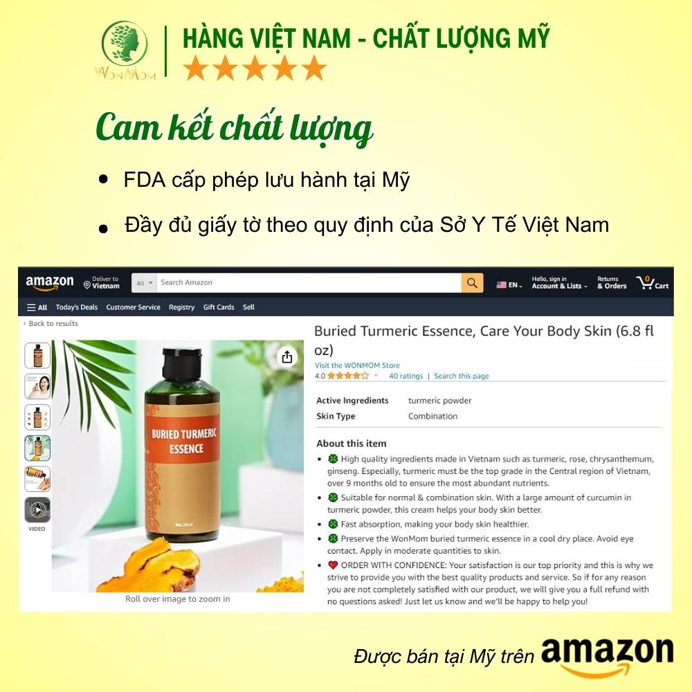 - Tác dụng từng thành phần: Sữa rửa mặt Wonmom: Chiết xuất tảo biển chứa vitamin C hỗ trợ quá trình sản sinh collagen, giúp làn da luôn tươi trẻ và đàn hồi và Niacin giúp làm mờ các vết sẹo và làm sáng da. Trà xanh giàu vitamin B và vitamin E, hai hợp chất rất cần thiết cho sức khỏe của da. Vitamin B giúp duy trì sản xuất collagen, làm tăng độ đàn hồi của da. Collagen là một trong những hợp chất hàng đầu trong các sản phẩm chống lão hóa vì nó làm săn chắc da và ngăn ngừa nếp nhăn. Vitamin E giúp thúc đẩy tái tạo tế bào. Vitamin này có tác dụng hydrat hóa và nuôi dưỡng da. Tinh chất cà rốt chứa rất nhiều beta carotene, vitamin K1, kali cũng như chất chống oxy hóa giúp da trắng hồng, mịn màng. Dầu dừa chứa nhiều vitamin C, kích thích sản sinh collagen, giúp da căng bóng. Thành phần chính của nghệ là curcumin, trị thâm, liền sẹo, mang lại làn da tươi trẻ. Cốt nghệ hạ thổ Wonmom: Thành phần chính của tinh bột nghệ là curcumin giúp tái tạo làn da, xóa mờ vết thâm, giúp da trắng hồng tự nhiên. Tinh chất hoa hồng chứa chất chống oxy hóa và các hợp chất kháng khuẩn làm se lỗ chân lông, kể cả ở da nhạy cảm, giúp cân bằng chất dầu trên da nhờn, làm mềm và làm da tươi sáng. Hoa cúc rất hữu dụng trong việc làm đẹp da bởi có chứa vitamin A, vitamin E, flavonoid đều là những chất chống oxy hóa, làm sạch da và trị mụn hiệu quả. Các thành phần Saponin có trong nhân sâm giúp thúc đẩy quá trình tái tạo máu và tăng cường oxy giúp cho mạch máu lưu thông tốt nên có tác dụng làm da căng hồng và tươi sáng. Các thành phần eugenol, gamma-caryophyllene và methyl eugenol trong hương nhu giúp kháng khuẩn, sáng da. Trong bạch chỉ có lipid, glucid làm mờ vết nám, da căng mịn, khỏe mạnh. 5.Chất lượng sản phẩm: