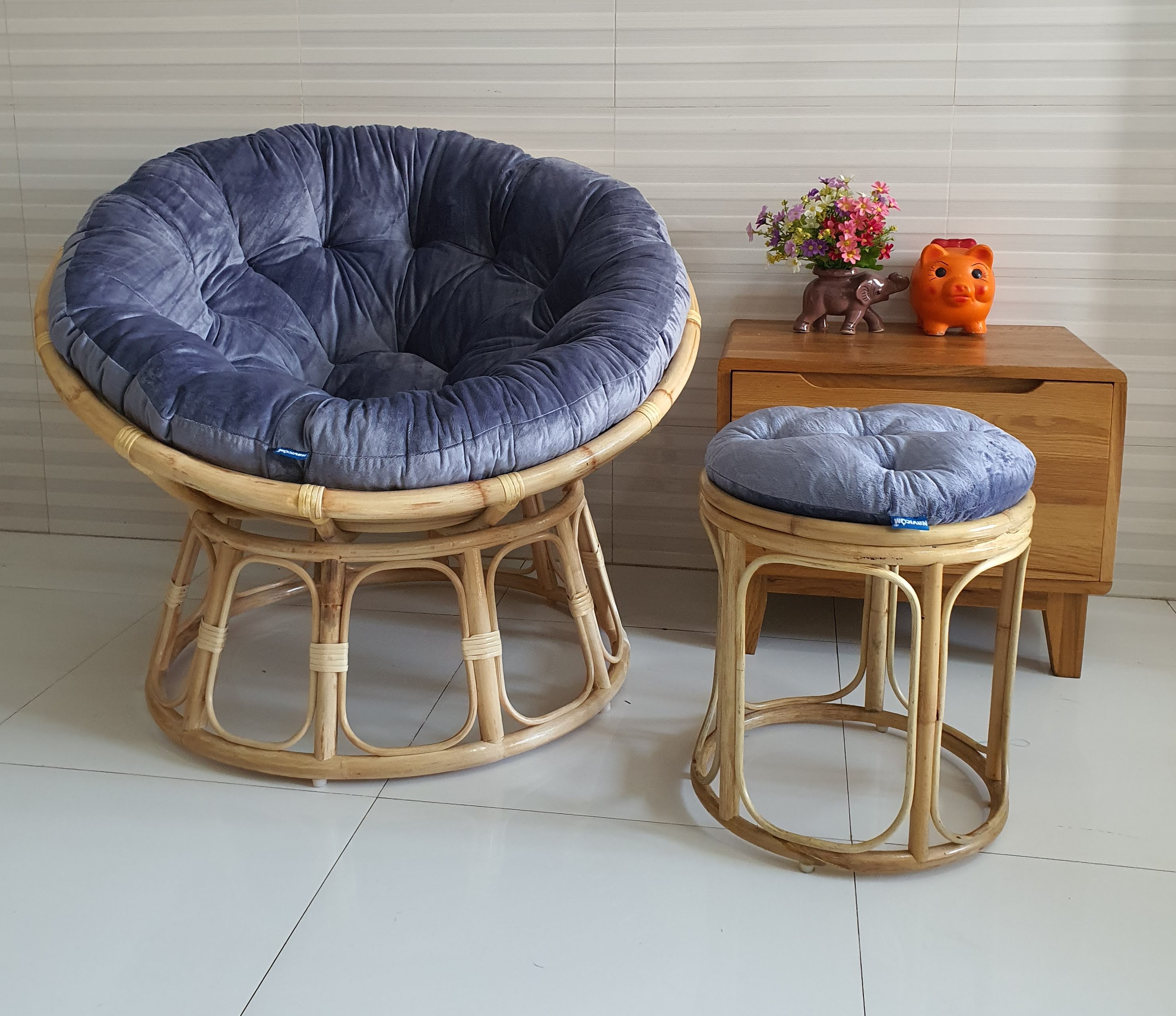 - Kích Thước : D 1m x cao 74cm - Chất liệu : + khung : mây song mật + nệm : gòn bi xuất khẩu bọc vải nhung Ghế thư giãn papasan phù hợp