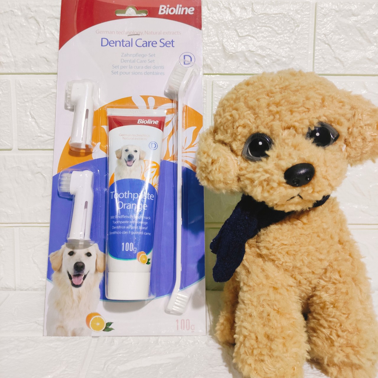 Bộ Kem đánh răng cho chó Bioline 100g + Bàn chải gồm: - 1 tuýt kem đánh răng 100g - 1 bàn chải răng 2 đầu - 2 ngón tay cọ răng ƯU ĐIỂM: -