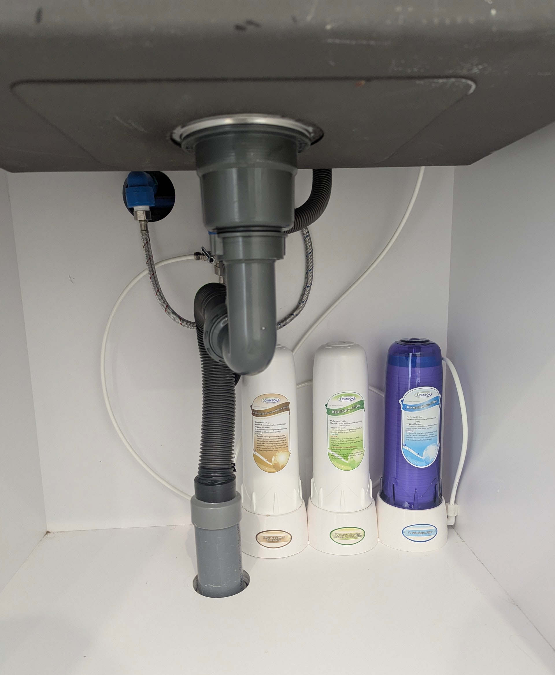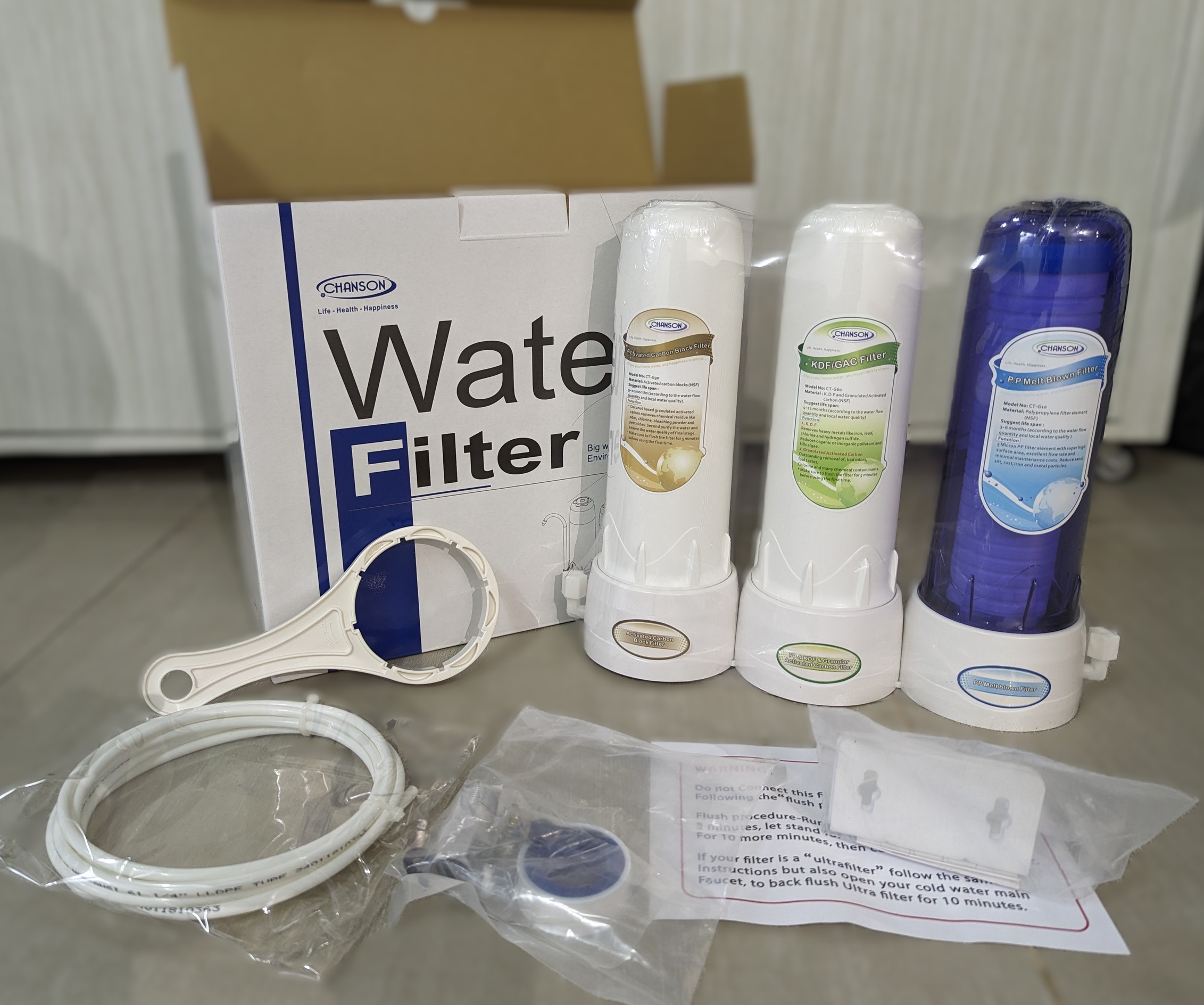 - Lắp âm bàn, kèm vòi nước inox 304 khoan lỗ lắp ngay bồn rửa hoặc mặt bàn bếp [I] Bộ lọc SF có 3 cấp lọc với các ruột lọc như sau: Bộ lọc thiết kế chắc chắn, ruột lọc 10-inch lắp bằng ren vặn chắc chắn, tránh rò rỉ nước bẩn qua khe lắp.