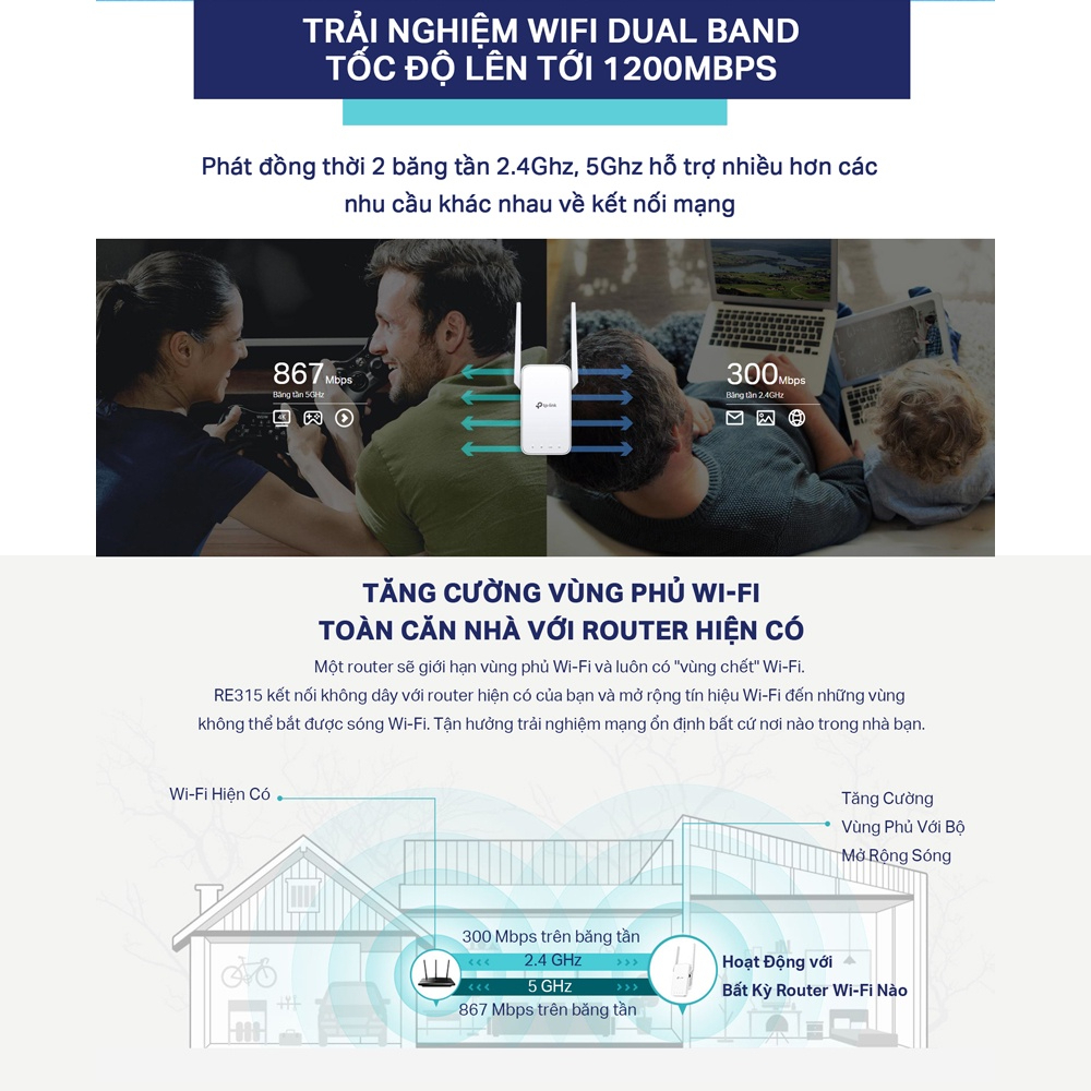 Bộ Mở Rộng Sóng Wifi Mesh TP-Link RE315 Chuẩn AC 1200Mbps - Loại bỏ vùng tín hiệu yếu với sóng Wi-Fi phủ toàn căn nhà của bạn. - Kết nối Wi-Fi băng tần kép 2.4 GHz