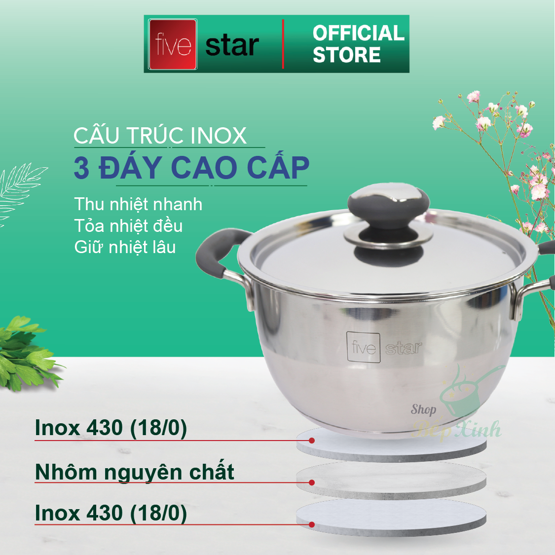 - 1 Nồi Fivestar đường kính 20cm, chiều cao 12cm + nắp inox quai silicon
