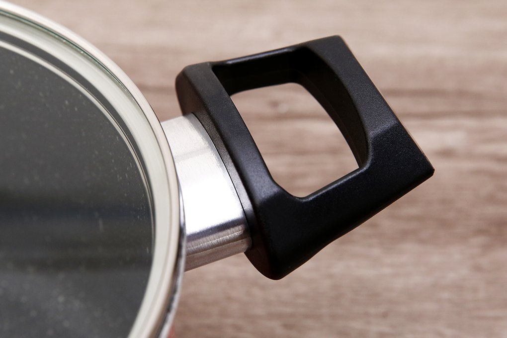 Quai cầm nồi có độ dài vừa phải, chất liệu bằng nhựa Bakelite cách nhiệt, mềm và êm tay, chống trơn trượt.