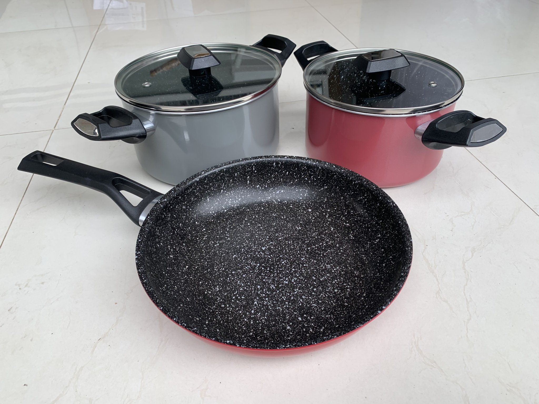 Là bộ nồi cao cấp với màu sắc cực sang, được làm từ chất liệu thân nhôm đúc dày và phủ đá cẩm thạch 3 lớp chống dính. Thân nhôm đúc dày mang lại khả