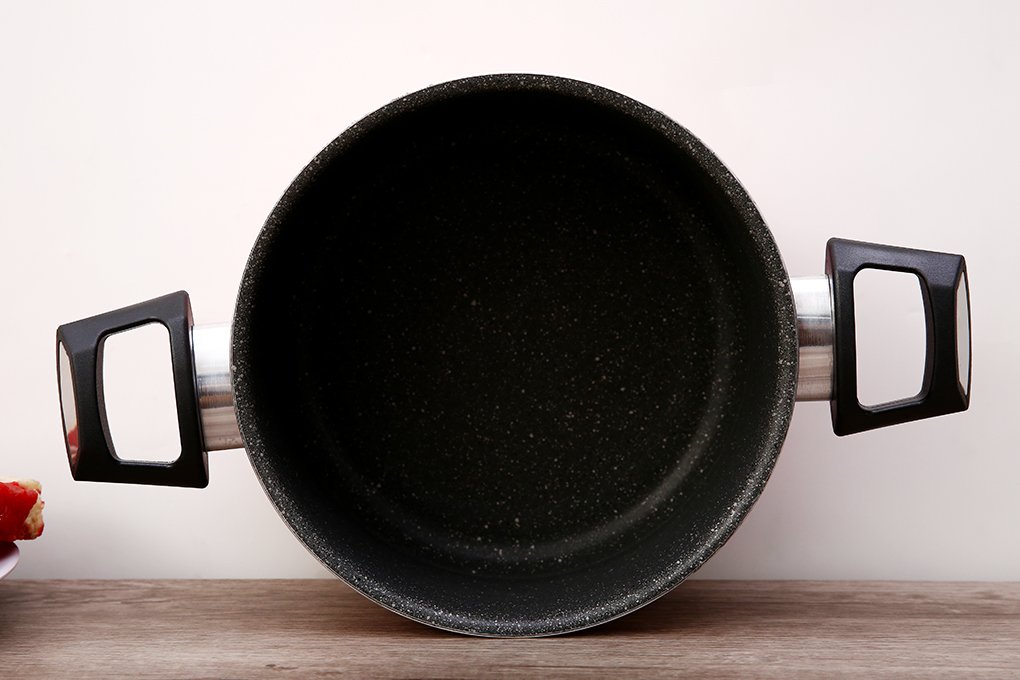 Bề mặt nồi chảo được xử lý bằng chất liệu chống oxy hóa sau đó được phủ lớp chống dính PTFE vân đá cao cấp sang trọng, chịu được nhiệt độ lên tới 450 độ C, không phản ứng với thức ăn, khả năng chống dính tốt.