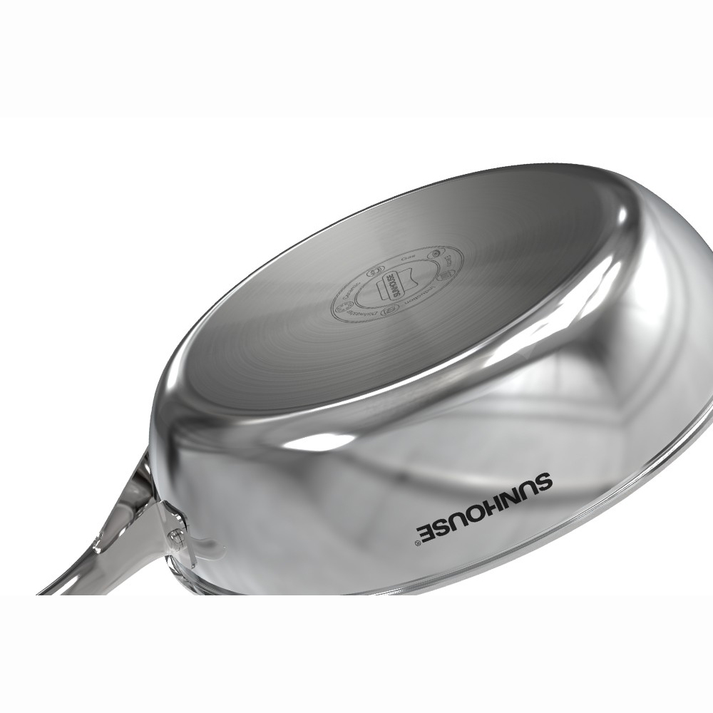 Thân nồi được làm từ Inox sáng bóng Bộ Nồi Chảo Inox 304 Đáy Liền Sunhouse SHG808 chất liệu Inox không gỉ giúp bộ sản phẩm sáng bóng và dễ dàng vệ sinh, lau chùi.