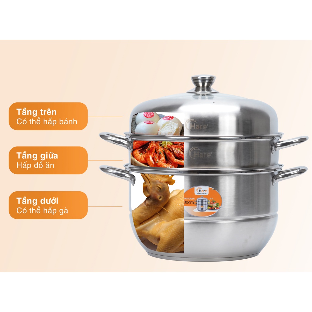 Bộ nồi hấp 3 tầng Inox cao cấp Hare size 28cm/30cm vung kín - Hấp xôi, gà, bánh bao Zalo 0986588655