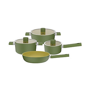 Set gồm 6 món tiện dụng: •  Chảo nhỏ 20cm & chảo lớn 24cm •  Quánh nhỏ 16cm & quánh lớn 18cm (đều kèm nắp) •  Nồi nhỏ 24cm & nồi lớn 24cm (đều kèm