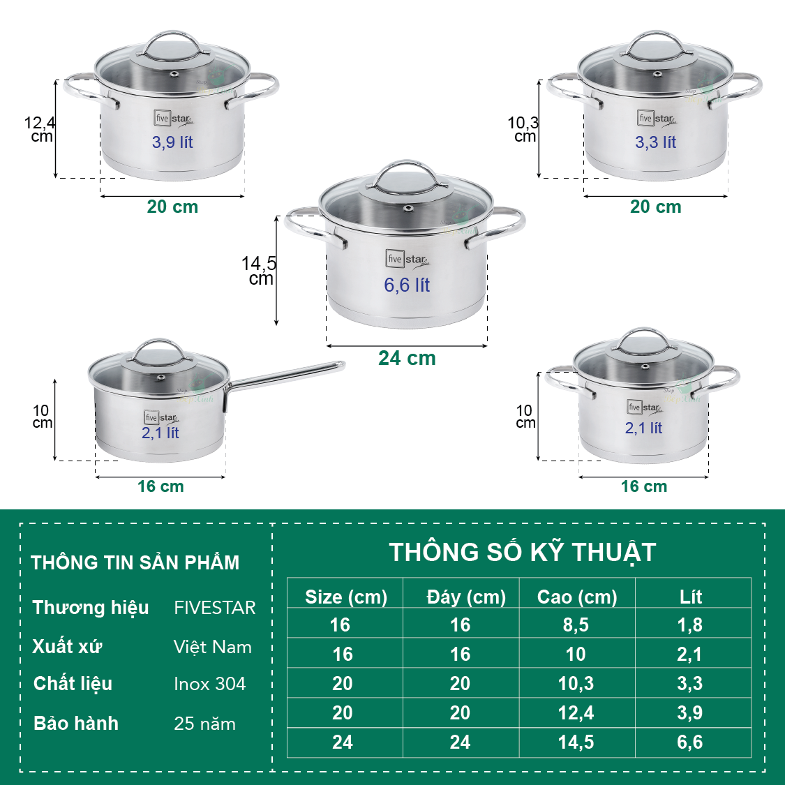 Bộ 3 inox 304 đúc liền khối xịn đẹp fivestar bảo hành 25 năm zalo 0986588655