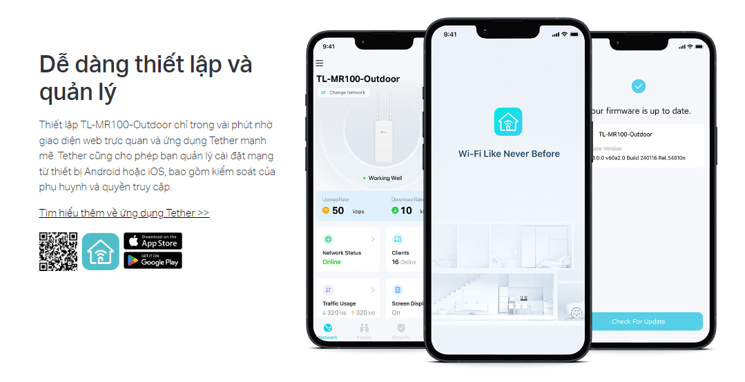 - Thiết lập đơn giản: Quản lý mạng dễ dàng qua ứng dụng Tether. Wi-Fi 4G Tốc Độ Cao Internet Ổn Định Ở Mọi Nơi Mở Rộng Wi-Fi Ở Mọi Nơi Trong Nhà Bạn Kết Nối Internet Wi-Fi 4G Ổn Định TL-MR100-Outdoor hỗ trợ 4G LTE với tốc độ tải xuống lên tới 150 Mbps, kết hợp với Wi-Fi nhanh đến 300 Mbps, mang đến trải nghiệm mạng liền mạch.* Chỉ cần lắp SIM để tận hưởng Internet ổn định trong nhà và ngoài trời. ◇ ◇ Thiết bị yêu cầu SIM đã kích hoạt và không có mã PIN. Nếu SIM bị khóa, vui lòng tham khảo hướng dẫn cài đặt nhanh để mở khóa. Thiết Kế Ngoài Trời Bền Bỉ Trong Mọi Thời Tiết Được thiết kế cho môi trường khắc nghiệt, TL-MR100-Outdoor có khả năng chống nước IP65, hoạt động trong dải nhiệt từ -30°C đến 60°C và bảo vệ chống sét 6kV & chống tĩnh điện 15kV. Duy trì kết nối không gián đoạn trong thời tiết xấu, mang lại hiệu suất mạng ngoài trời ổn định. Lắp Đặt linh Hoạt Cho Nhiều Môi Trường Khác Nhau TL-MR100-Outdoor hỗ trợ nhiều phương án lắp đặt — gắn lên cột, tường hoặc dán lên cửa sổ. Tính linh hoạt này phù hợp với nhiều môi trường, từ thành thị đến nông thôn. Dễ dàng tìm vị trí tối ưu để đảm bảo tín hiệu và kết nối ổn định. Hỗ Trợ Nguồn PoE/DC: Đơn Giản Hóa Lắp Đặt Ngoài Trời Dễ dàng thiết lập và quản lý Thiết lập TL-MR100-Outdoor chỉ trong vài phút nhờ giao diện web trực quan và ứng dụng Tether mạnh mẽ. Tether cũng cho phép bạn quản lý cài đặt mạng từ thiết bị Android hoặc iOS, bao gồm kiểm soát của phụ huynh và quyền truy cập.