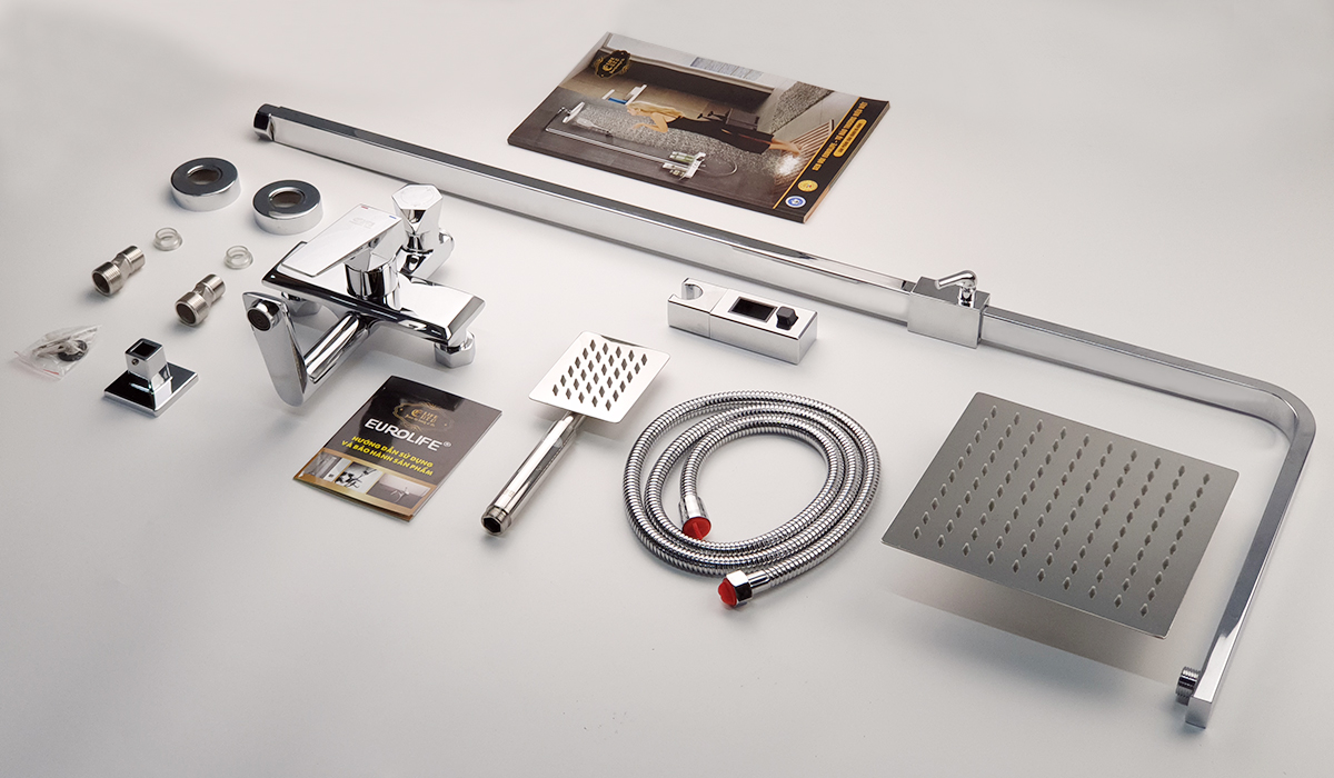 Thân vòi được thiết với hình vuông góc, mạnh mẽ. Tay mở nguồn nước và núm chuyển chế độ nằm mặt trước tiện dụng. Đặc điểm nổi trội của các sản phẩm Eurolife là nước mạ tinh xảo, sáng bóng không tì vết, mang lại sự hoàn hảo và sang trọng cho phòng tắm