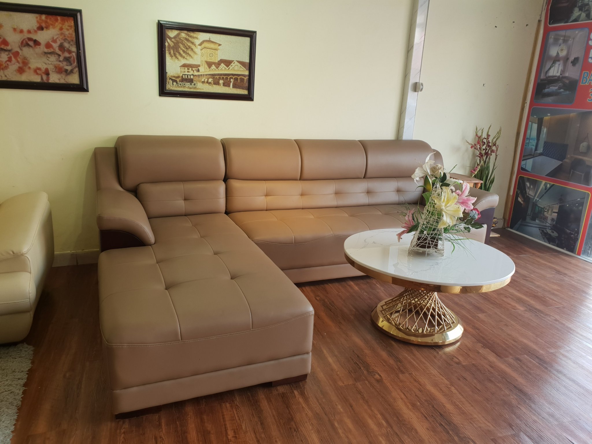 Bộ sofa phong cách tân cổ điển.  Ghế Sofa Góc L Phối Viền Trẻ Trung_Màu Kem Viền Nâu_Size 2500 x 1600