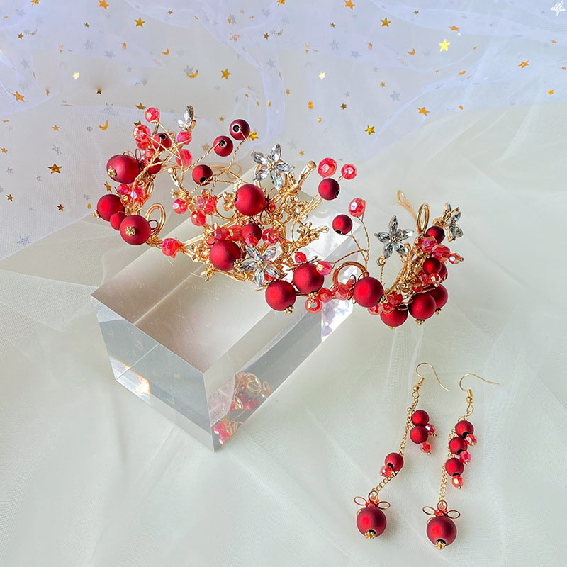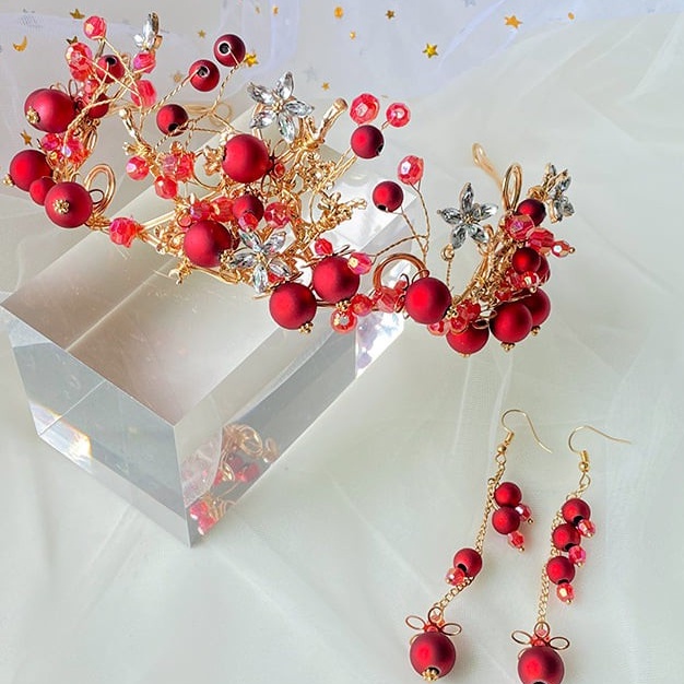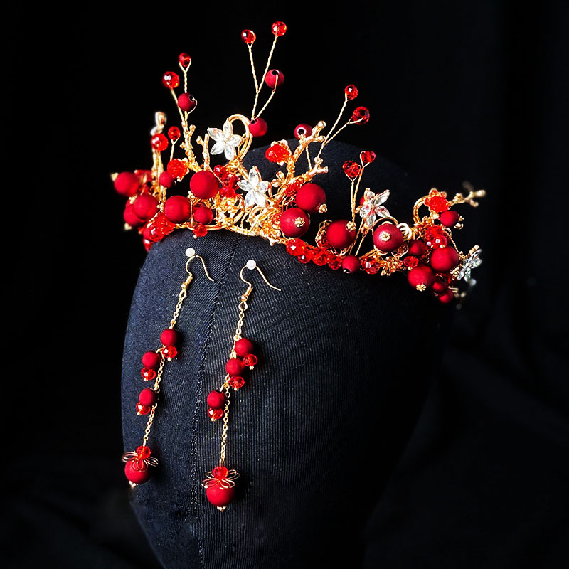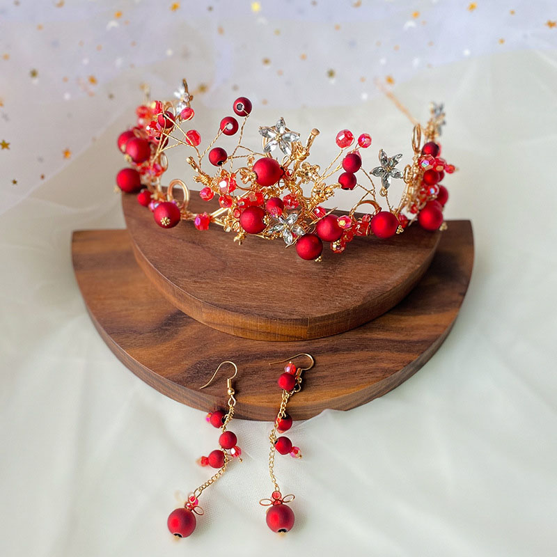 ✨Bộ trang sức trang điểm cô dâu Vương miện và bông tai ngọc đỏ nổi bật VM19