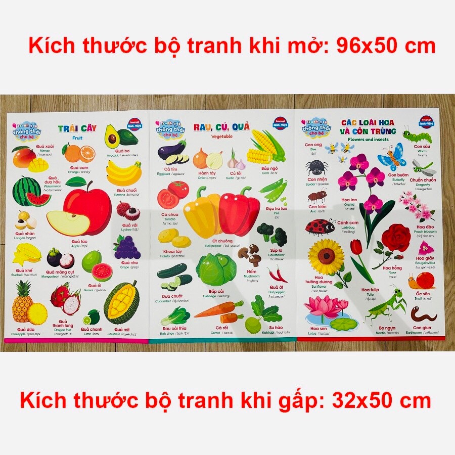 ✨Bộ Tranh Gấp Thông Thái Cho Bé - Song Ngữ Anh Việt - 3 Tấm, 6 Mặt, 17 Chủ Đề, Kích Thước 96 x 50cm