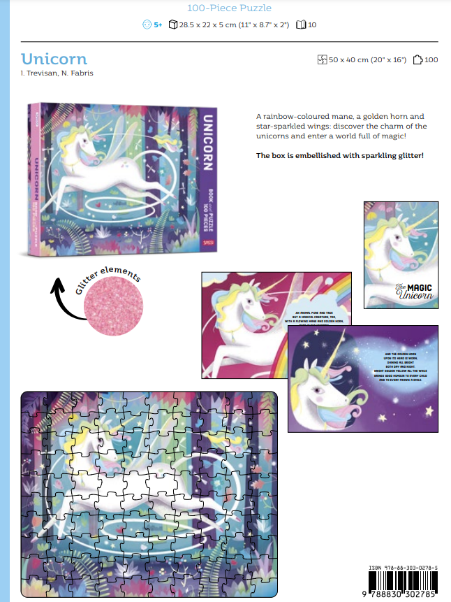A rainbow-coloured mane, a golden horn and star-sparkled wings: discover the charm of the unicorns and enter a world full of magic! Puzzle dimension: 50 x 40 cm (20" x 16")