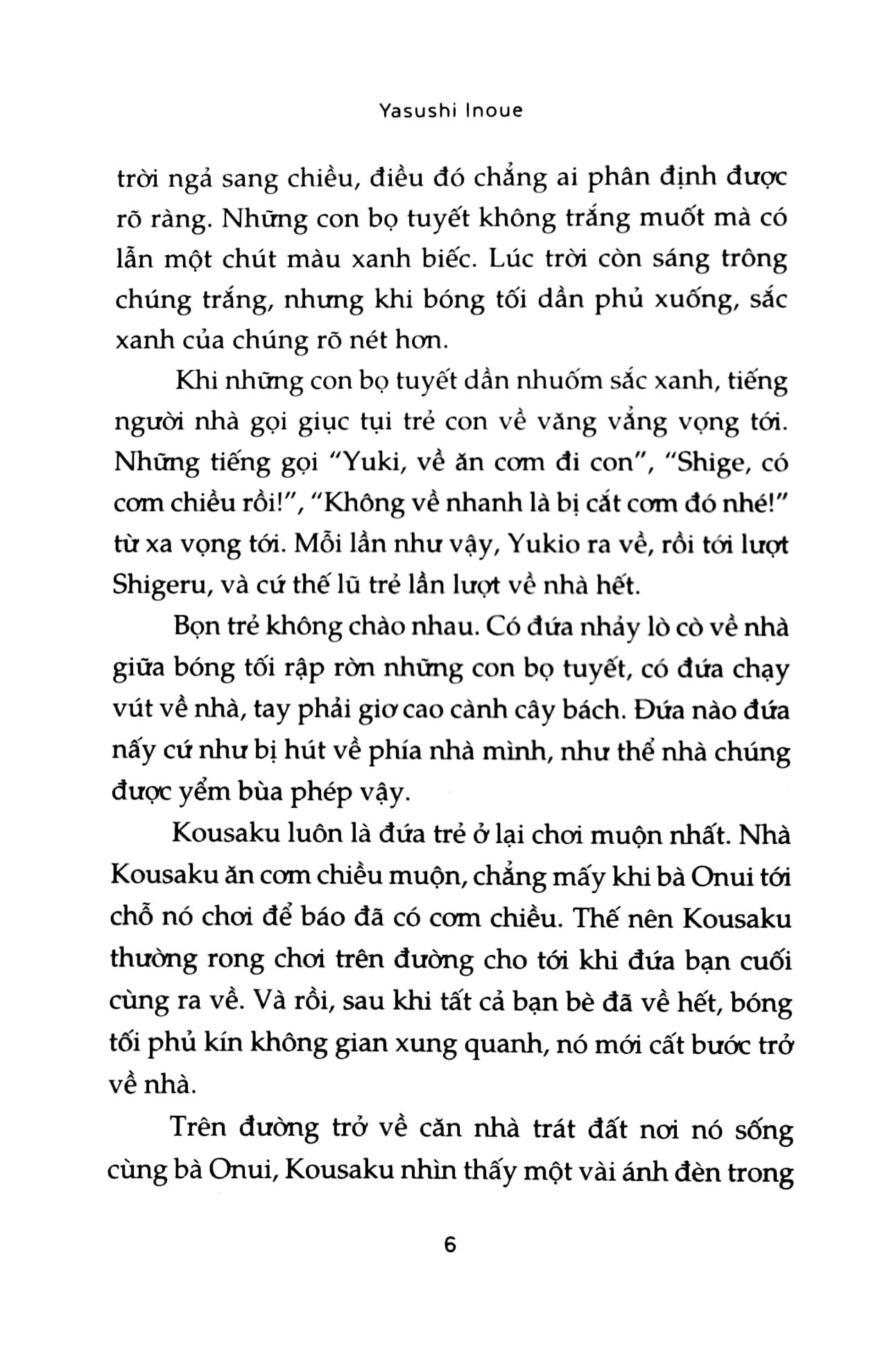 YASUSHI INOUE (1907-1991) sinh tại Asahikawa. Sau khi tốt nghiệp khoa Triết học Đại học Kyoto, ông làm việc tại tòa soạn báo Mainichi Shimbun. Năm 1949, ông nhận giải thưởng văn học Akutagawa với tác phẩm Đấu bò. Năm 1951, ông nghỉ làm tại tòa soạn để chuyên tâm sáng tác và đã cho ra đời hàng loạt kiệt tác văn học. Năm 1976, ông nhận Huân chương Văn hóa. Các tác phẩm tiêu biểu: Đấu bò, Súng săn, Tường băng, Mái ngói Tempyo, Đôn Hoàng, Bọ tuyế