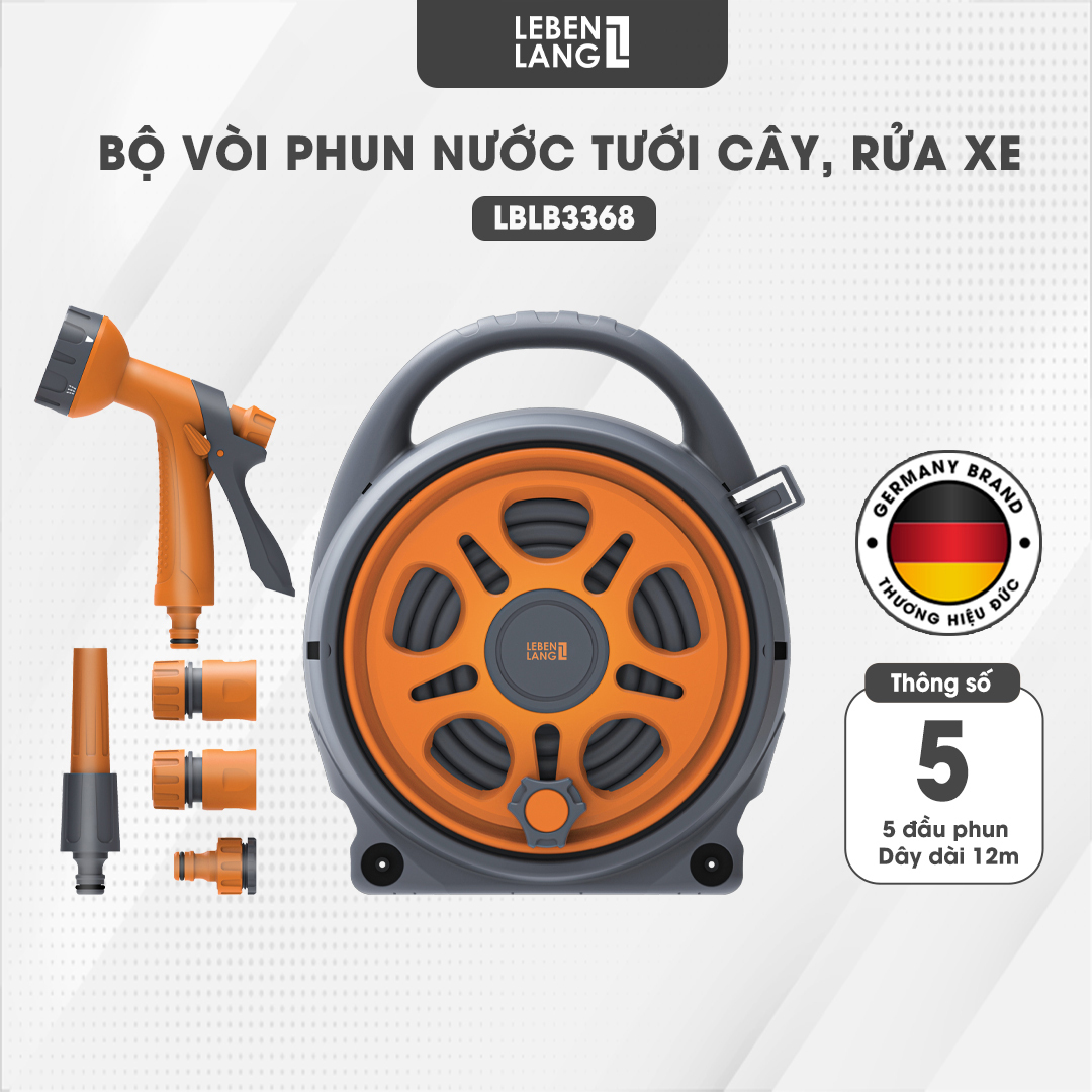 Bộ vòi nước tưới cây, rửa xe đa năng Lebenlang LBLB3368 dây dài 12m, 5 đầu phun đi kèm - hàng chính hãng 8 LÝ DO NÊN CHỌN BỘ VÒI TƯỚI CÂY LBLB3368 CỦA LEBENLANG - Dây Cuộn Tự Động - Sử dụng Dễ dàng và nhanh chóng - Cơ Chế Tăng Áp Lực Nước - Thiết kế đa năng với 5 chế độ phun nước đa dạng - Chất Liệu An Toàn từ nhựa tổng hợp ABS/PP/POM/PVC không độc hại - Tiện Lợi và Đa Năng - Thu Gọn Dễ Dàng không chiếm nhiều diện tích - Chất Lượng Đáng Tin Cậy: Thương hiệu Lebenlang đến từ Đức I. THÔNG SỐ KỸ THUẬT - Thương hiệu: Lebenlang - Model: LBLB3368 - Dây dài: 12m - Cân nặng: 2kg - Kích thước: 32 x 32 x 13 cm - Phụ kiện gồm:1 cuộn ống nhỏ, 2 đầu nối ống, 1 bộ chuyển đổi vòi , 1 súng phun và 1 vòi phun. II. ĐẶC ĐIỂM NỔI BẬT - Đem lại sự tiện lợi và đa năng cho mọi người trong gia đình, bộ vòi nước tưới cây và rửa xe Lebenlang LBLB3368 là lựa chọn hàng đầu cho nhu cầu vận động trong việc chăm sóc cây cảnh và bảo dưỡng xe hơi. - Bộ vòi nước tưới cây LBLB3368 Dây Cuộn Tự Động: Dây dài 12 mét tự động cuộn lại sau mỗi lần sử dụng, tiết kiệm không gian và dễ dàng lưu trữ. - Xịt rửa đa năng Lebenlang sử dụng Dễ dàng và nhanh chóng trong việc lắp đặt và sử dụng, không cần kỹ thuật chuyên nghiệp. Chỉ cần một chút xoay núm và kéo dây, bạn sẽ sẵn sàng cho một buổi làm việc nhanh chóng và hiệu quả. - Máy xịt rửa Lebenlang Cơ Chế Tăng Áp Lực Nước: Nước phun ra xa và mạnh mẽ hơn nhờ vào cơ chế tăng áp lực thông minh. - Thiết kế đa năng với các chế độ phun nước đa dạng, từ tia nước mạnh mẽ đến phun sương nhẹ nhàng, giúp bạn dễ dàng điều chỉnh để phù hợp với mọi tình huống sử dụng. - Bộ vòi phun tưới cây LBLB3368 Đa Chế Độ Phun Nước: Với 5 chế độ phun nước đa dạng, từ tia nước mạnh đến phun sương nhẹ nhàng, phù hợp với mọi nhu cầu sử dụng. - Chất Liệu An Toàn: Sản phẩm Vòi phun nước Lebenlang được làm từ nhựa tổng hợp ABS/PP/POM/PVC không độc hại với môi trường và con người