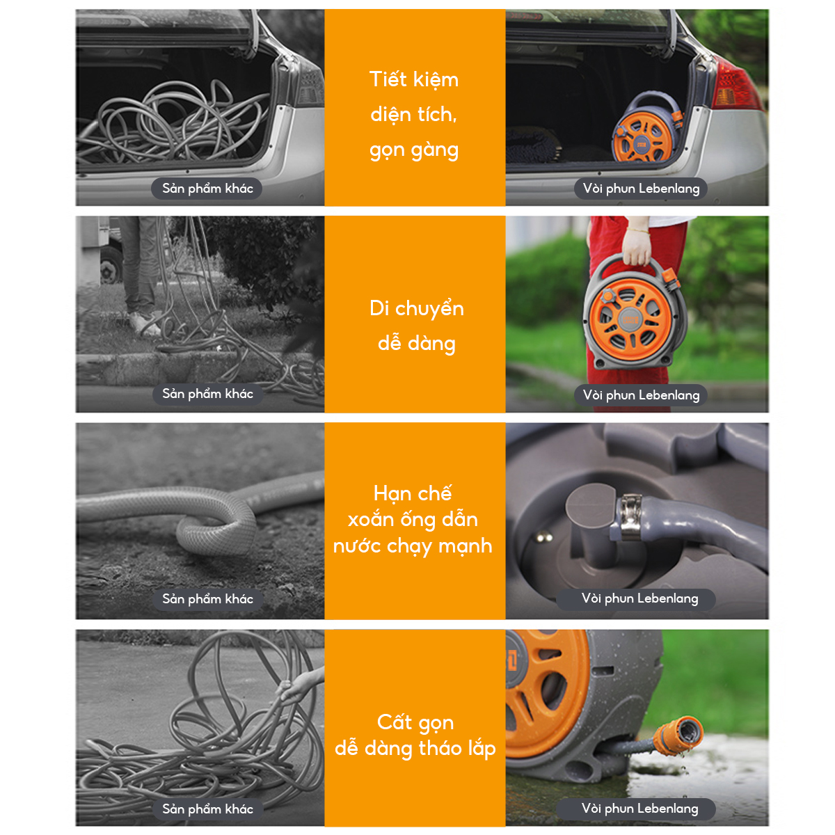 - Bộ vòi phun Lebenlang Thu Gọn Dễ Dàng: Thu cuộn ống nước dễ dàng bằng cách xoay núm vặn chiều kim đồng hồ, giúp tiết kiệm không gian và di chuyển dễ dàng.