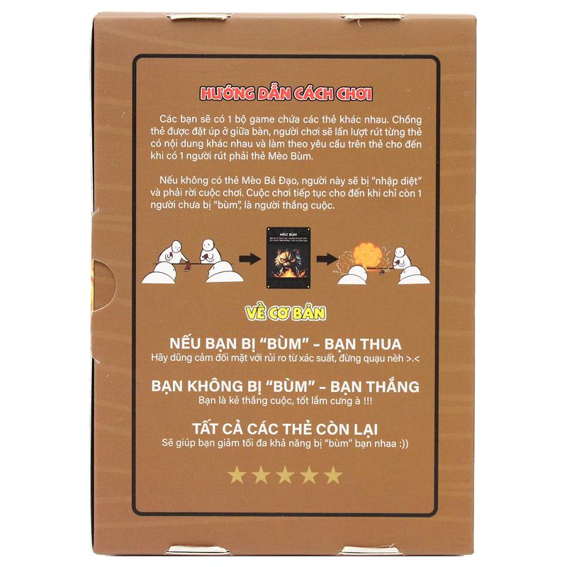 Mua tại TiktokBoardgame Mèo Bùm - Liên Hiệp Thành Hướng dẫn cách chơi: Các bạn sẽ có 1 bộ game chứa các thẻ khác nhau. Chồng thẻ được đặt úp ở giữa bàn, người chơi sẽ lần lượt rút từng thẻ có nội dung khác nhau và làm theo yêu cầu trên thẻ cho đến khi có 1 người rút phải thẻ Mèo Bùm. Nếu không có thẻ Mèo Bá Đạo, người này sẽ bị “nhập diệt” và phải rời cuộc chơi. Cuộc chơi tiếp tục cho đến khi chỉ còn 1 người chưa bị “bùm” là người thắng cuộc. Về Cổ Bảo NẾU BẠN BỊ “BÙM” – BẠN THUA Hãy dũng cảm đối mặt với rủi ro từ xác suất, đừng quạu nèh >.< BẠN KHÔNG BỊ “BÙM” – BẠN THẮNG Bạn là kẻ thắng cuộc, tốt lắm cưng à !!! TẤT CẢ CÁC THẺ CÒN LẠI Sẽ giúp bạn giảm tối đa khả năng bị “bùm” bạn nhaa :))