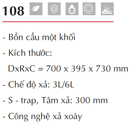 - KT thùng : 700x395x730 mm Bồn cầu 1 khối Chế độ xả: 3L/6L Tâm xả: 300mm Nắp êm, van xả cao cấp Cửa xả: S - trap Công nghệ xả Xoáy