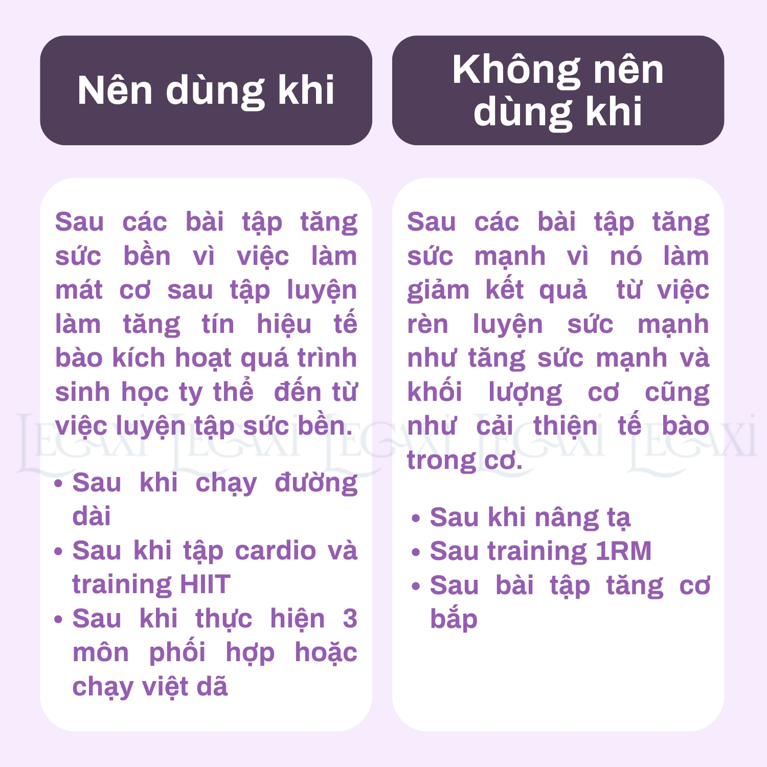 Với phương pháp tắm nước đá, hầu hết các nghiên cứu đề xuất ngâm cơ thể đến ngang phần hông ở nhiệt độ 10-15 độ C trong khoảng 10 phút.
