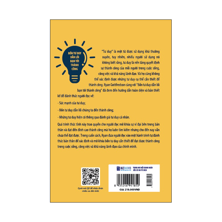 Cuốn sách “Bốn tư duy dẫn lối bạn tới thành công” là một hành trình thức tỉnh bản thân, bạn sẽ khám phá ra những cấp độ sâu thăm và căn bản nhất của chính mình. Có thể không phải tốt tuyệt đối, nhưng bạn sẽ trở nên mạnh mẽ hơn để thực hiện những thay đổi mang tính quyết định cho việc phá bỏ đi những tư duy đang tự kìm hãm, và đột phá để vươn tới những tầm cao mới của thành công cũng như phát huy hết tiềm năng của bản thân.