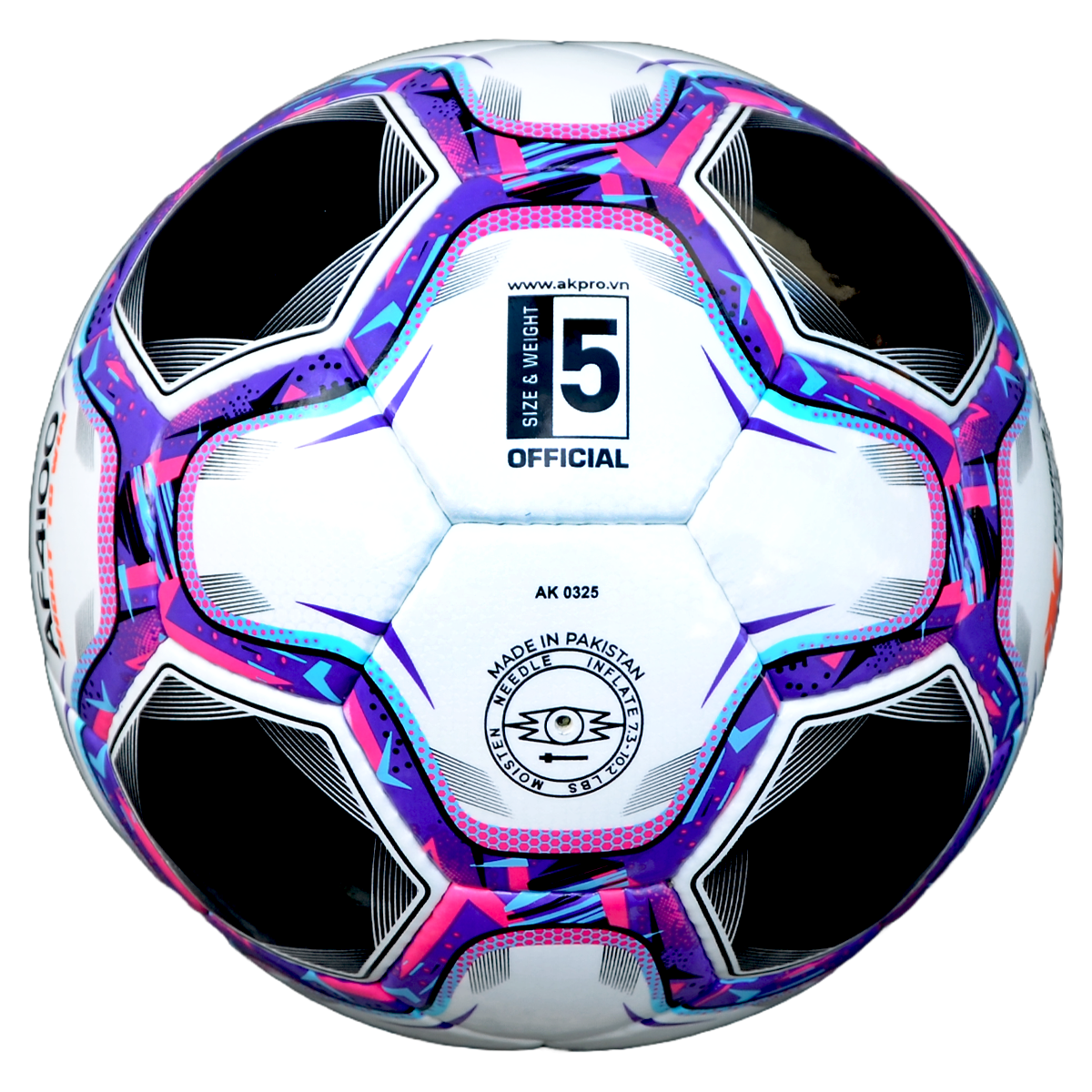 THÔNG TIN SẢN PHẨM Mã sản phẩm: AF4100 Size: 5 Chuyên chơi: Sân 7 - sân 11 Số miếng ghép: 32 Màu: Trắng - Đen - Tím/Hồng/Xanh Sản xuất tại: Pakistan Chất liệu: Da Maracana