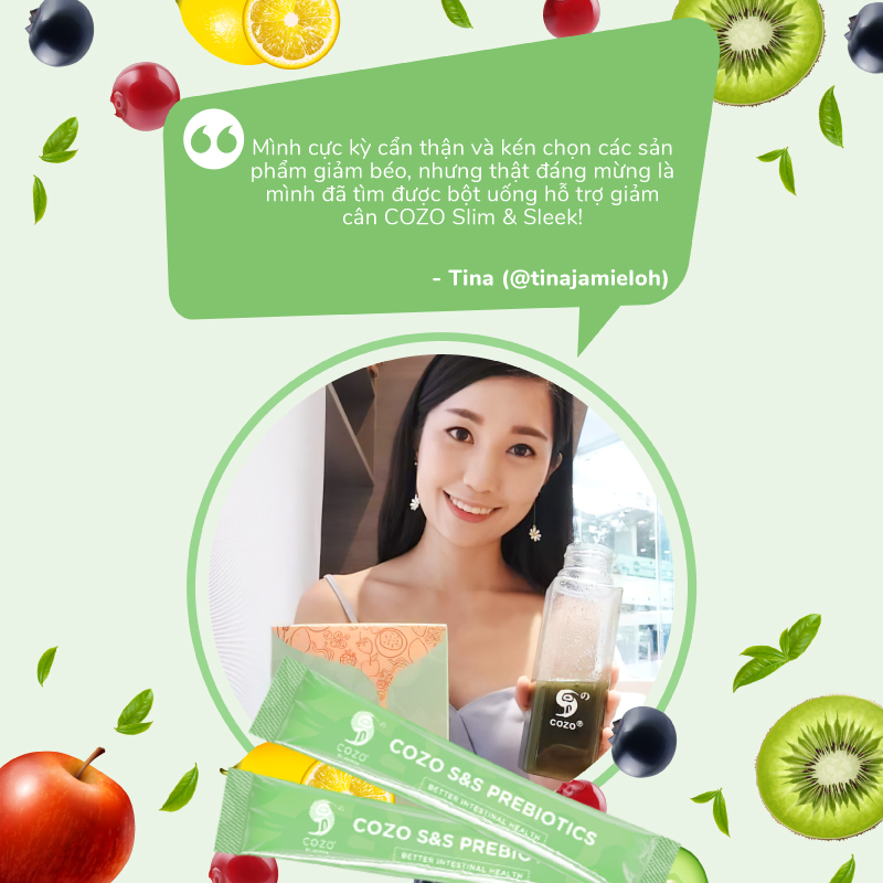 • Các thói quen xấu khác Tác dụng của Bột uống hỗ trợ giảm cân và chăm sóc hệ tiêu hóa Cozo Slim & Sleek • 100% nguồn gốc từ thực vật, bổ sung dinh dưỡng cần thiết • Đào thải chất béo và chất liên kết các mô mỡ • Phá vỡ chất béo và giảm lượng carbohydrate  • Chống đầy hơi và chướng bụng • Chống oxy hóa và chống glycation (tác nhân gây bệnh tiểu đường) • Tăng cường trao đổi chất và đốt kalo • Hàm lượng vitamin và khoáng chất cao • Trung hòa và điều chỉnh độ pH cho đường ruột • Tăng cường hệ thống miễn dịch hiệu quả Thành phần :