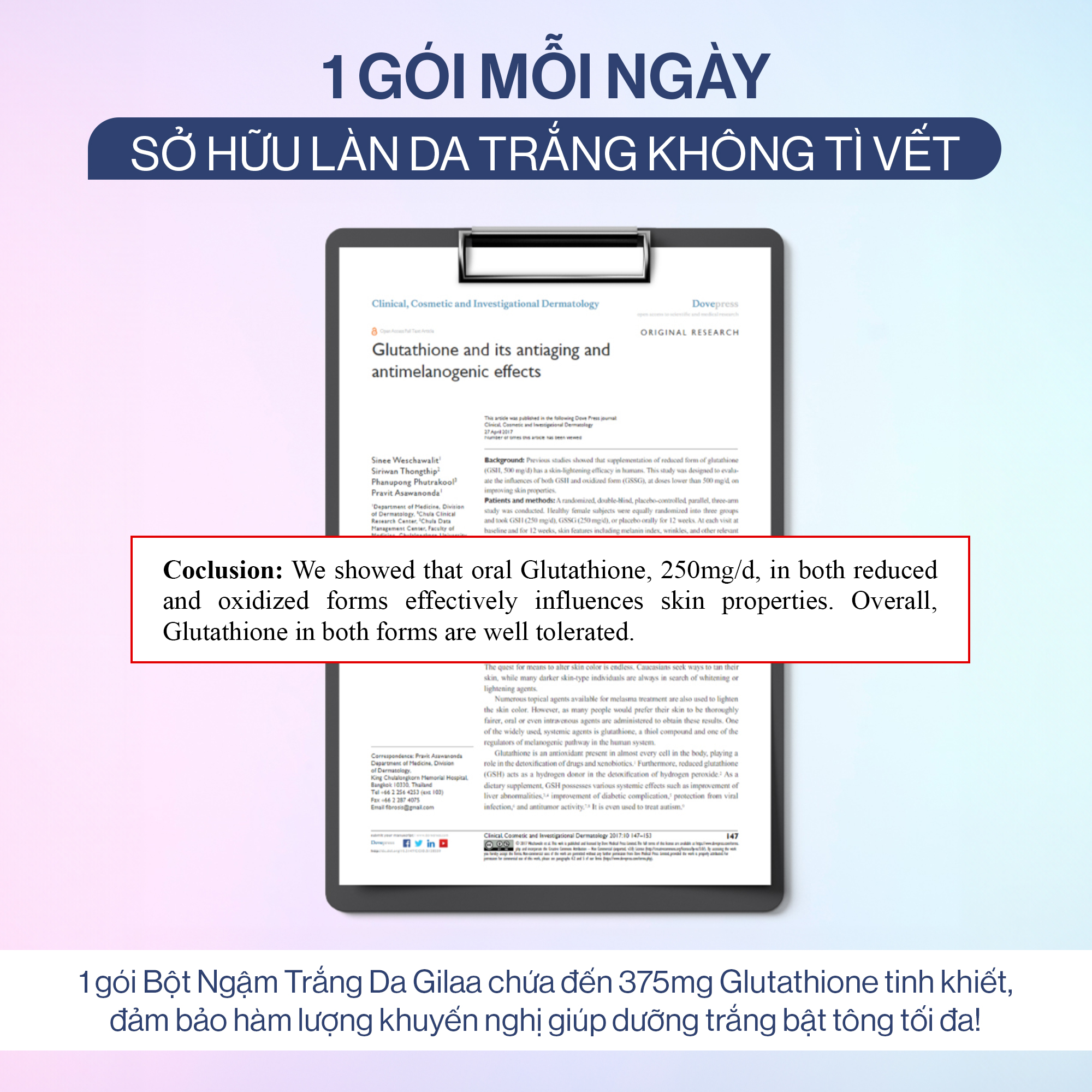 Bột ngậm trắng da Glutathione C Gilaa với công thức kết hợp các thành phần cao cấp Glutathione, Vitamin C, Elastin & Cà Chua Trắng giúp dưỡng trắng bật tông toàn thân hiệu quả nhanh & rõ rệt sau 28 ngày. Glutathione tinh khiết cao 75% nghiên cứu bởi công ty dược hàng đầu Hoa Kỳ AMF, mang lại hiệu suất dưỡng trắng cao & đảm bảo an toàn. Bột ngậm với công nghệ Melting hiện đại, hấp thụ trực tiếp qua niêm mạc miệng & tránh bị phân hủy bởi axit dạ dày.
