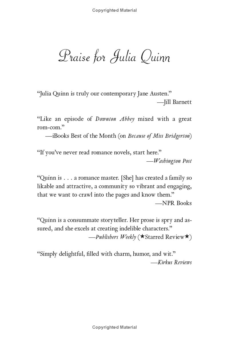 Contrary to popular belief, Kate is quite sure that reformed rakes do not make the best husbands—and Anthony Bridgerton is the most wicked rogue of them all. Kate’s determined to protect her sister—but she fears her own heart is vulnerable. And when Anthony’s lips touch hers, she’s suddenly afraid she might not be able to resist the reprehensible rake