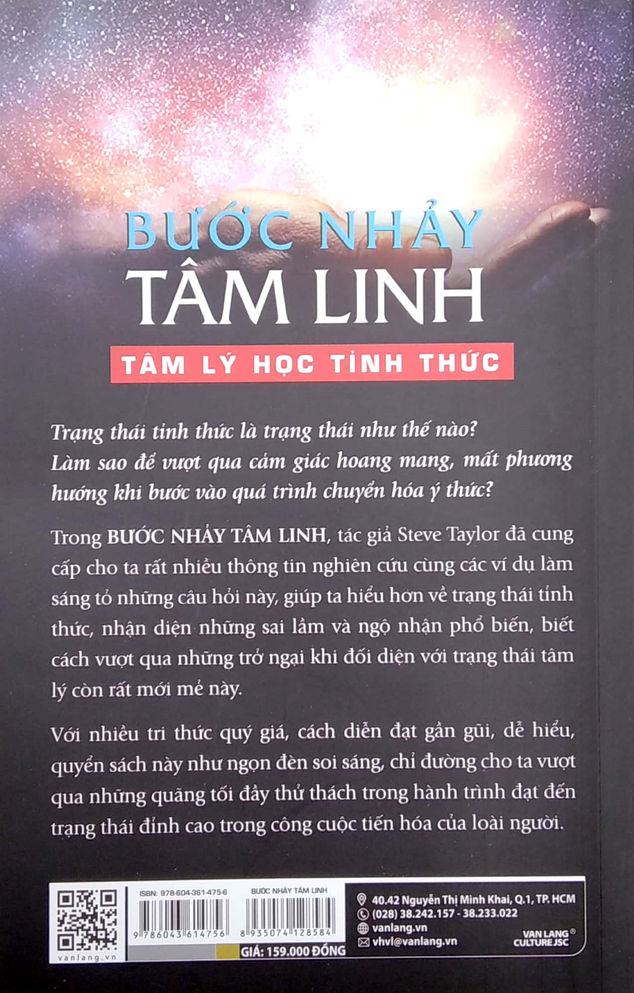 Trong BƯỚC NHẢY TÂM LINH, tác giả Steve Taylor đã cung cấp cho ta rất nhiều thông tin nghiên cứu cùng các ví dụ làm sáng tỏ những câu hỏi này, giúp ta hiểu hơn về trạng thái tỉnh thức, nhận diện những sai lầm và ngộ nhận phổ biến, biết cách vượt qua những trở ngại khi đối diện với trạng thái tâm lý Còn rất mới mẻ này.