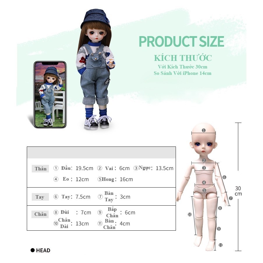 THÔNG TIN SẢN PHẨM - Tên: Búp Bê Bjd Xinh Xắn Cao 30cm Với 21 Khớp Linh Hoạt - Đồ Chơi Búp Bê Công Chúa Cho Bé Gái - Chất liệu: Nhựa - Vải -