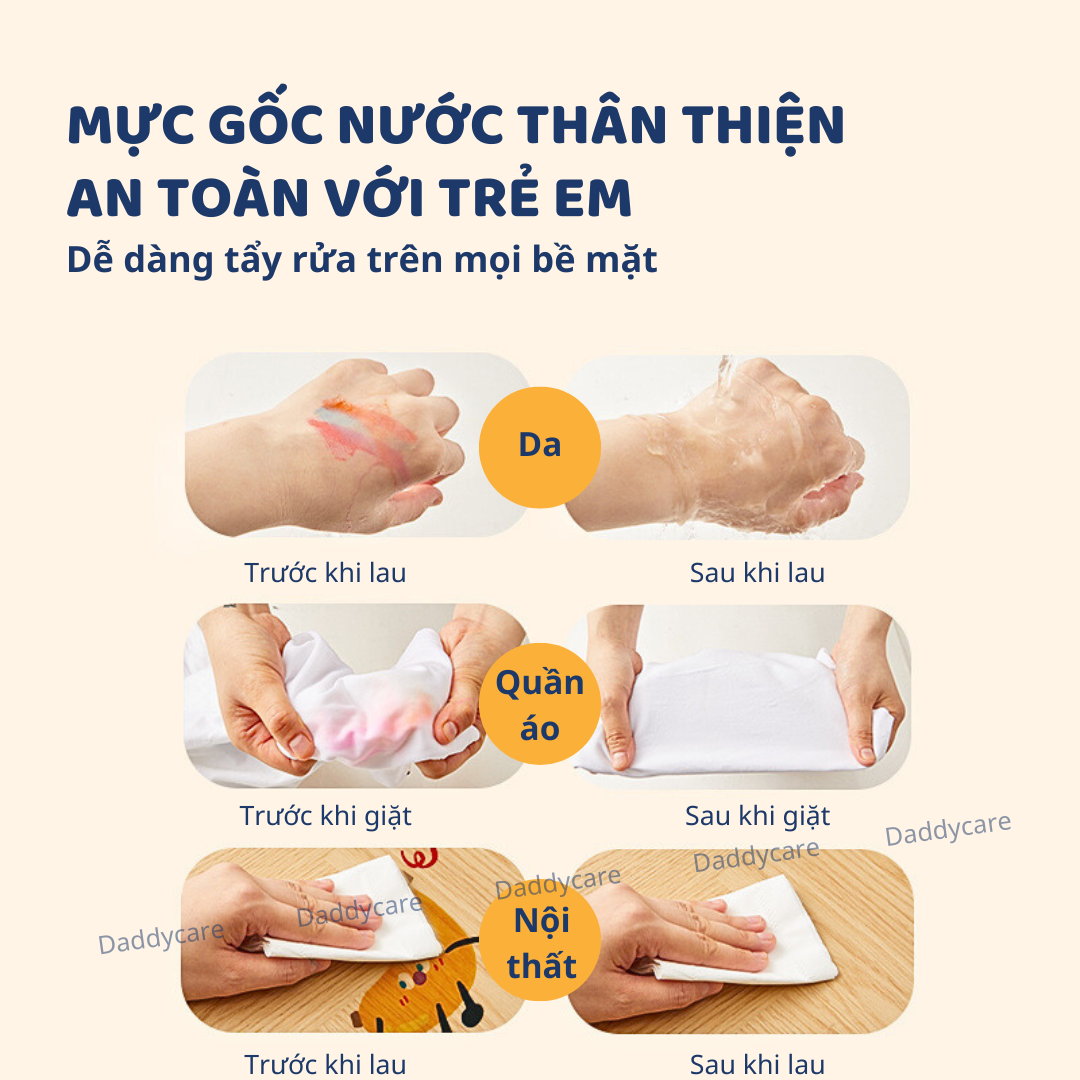 - Nguồn mực gốc nước thân thiện với trẻ nhỏ, dễ dàng tẩy rửa trên mọi bề mặt: trên da, trên bàn, trên quần áo,...