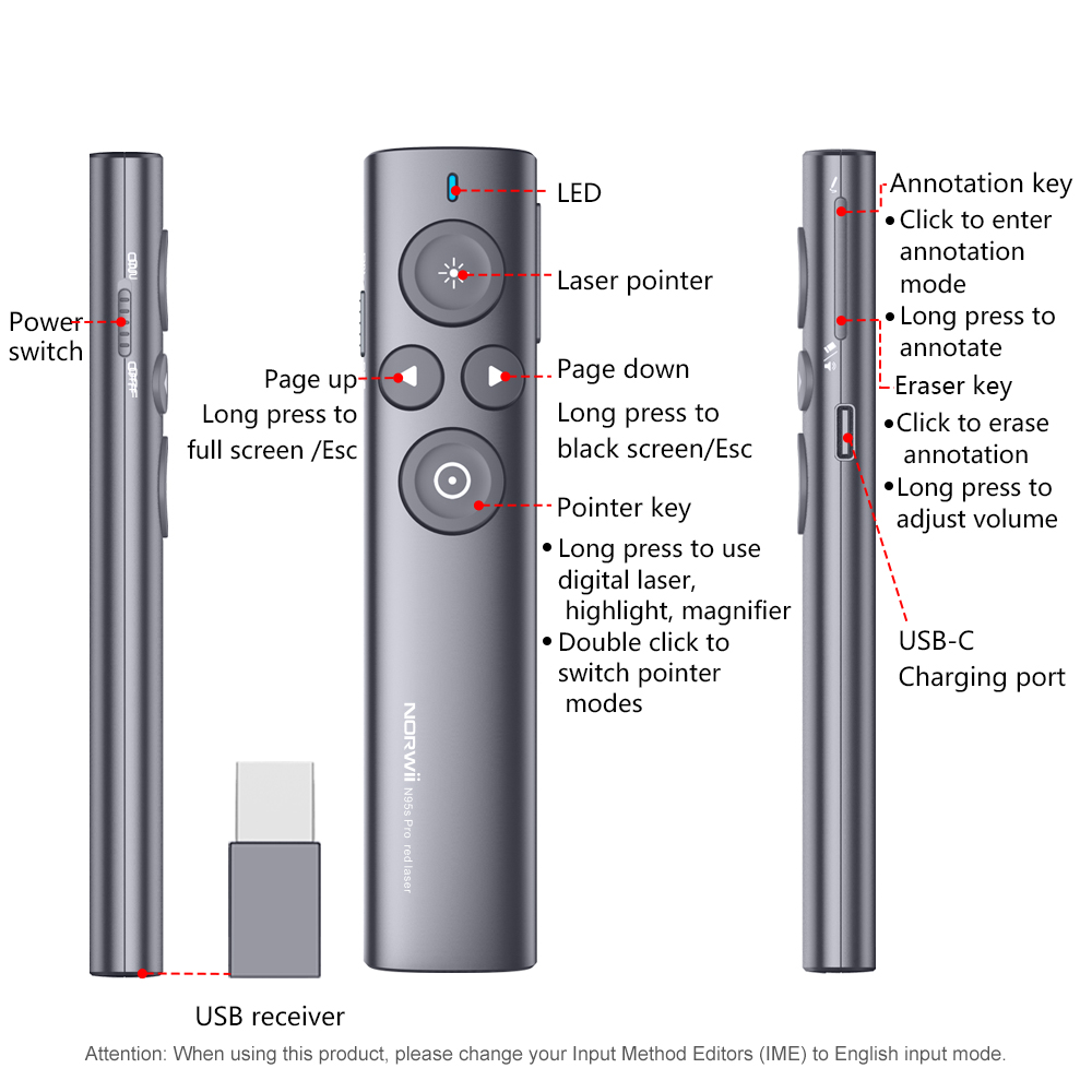 Bút trình chiếu NORWii N95 Pro Spotlight cao cấp 2in1 Thông số kỹ thuật :  Model : NORWii N95 Pro SPOTLIGHT Kết nối : 2.4GHz Đầu USB 2in1 :thu phát Wireless 2.4Ghz và USB dung lượng lưu trữ 256MB Bán kính hoạt động : 50m Laser : Tia kĩ thuật số và tia Laser vật lý ( màu đỏ ) Laser vật lý chỉ tối đa 200m Pin: Pin lithium 300mAh Nguồn sạc : 5V Cổng sạc : USB Type C Điện áp làm việc: 3.7V ~ 4.2V Kích thước: 131 29.6 13.2mm Cân nặng: 34.5g Chức năng : Thuyết trình, trình chiếu trong hội nghị, họp công ty, văn phòng, giảng bài trên các phần mềm như PowerPoint, Word, Canva và các phần mềm chuyên dụng khác. Hỗ trợ các HĐH : Windows, Linux, MacOS, Android từ 4.3 trở lên . Bộ sản phẩm gồm : Bút laser, Cáp sạc Type c, Túi đựng nhung, HDSD, Hộp. Sản phẩm cắm usb kết nối và dùng trực tiếp các tính năng cơ bản của bút trình chiếu Ưu điểm nổi bật : Tia chỉ kỹ thuật số giúp bạn có thể chỉ điểm rõ ràng trên mọi màn hình máy tính, tivi, màn máy chiếu, màn LED, màn LCD Ngoài ra, bút vẫn có laser vật lý tia đỏ như các dòng bút thông thường giúp bạn chỉ điểm trên màn chiếu,bảng, tường tiện dụng Bật , tắt video trong Slides dễ dàng chỉ bằng thao tác trên bút. Nhiều tính năng nâng cao trên bút giúp bài thuyết trình được trình bày sáng tạo nổi bật và chi tiết hơn. Tính năng Spotlight chọn vùng cần làm nổi bật ( có thể tăng hoặc giảm vùng chọn tùy ý ). Tính năng phóng to vùng chọn làm tăng kích thước điểm ảnh giúp người bên dưới quan sát rõ hơn. Tính năng chuột giúp thao tác trên slide như đang sử dụng chuột có thể bật tắt video, mở file, mở liên kết Bút cũng có chế độ rung hẹn giờ báo khi nào thời gian thuyết trình sắp hết để bạn chủ động hơn. Chế độ viết ghi chú Note trên Slides rất tiện lợi. Ngoài ra, còn 1 vài tính năng như tăng, giảm âm lượng, chuyển tab, rung báo kết nố , quý khách có thể tham khảo thêm trong phần mềm cài đặt quản lý. Bút mang đến sự thuận tiên cho người dùng với cổng sac USB C hiện đại và có thể dùng 3 tháng với chỉ 1 lần sạc 2h. Sản phẩm phù hợp với mọi nhu cầu thuyết trình từ cơ bản đến nâng cao. Đồng thời, rất thích hợp với nhu cầu trình chiếu trên màn hình tivi, màn LED đang phổ biến hiện nay.