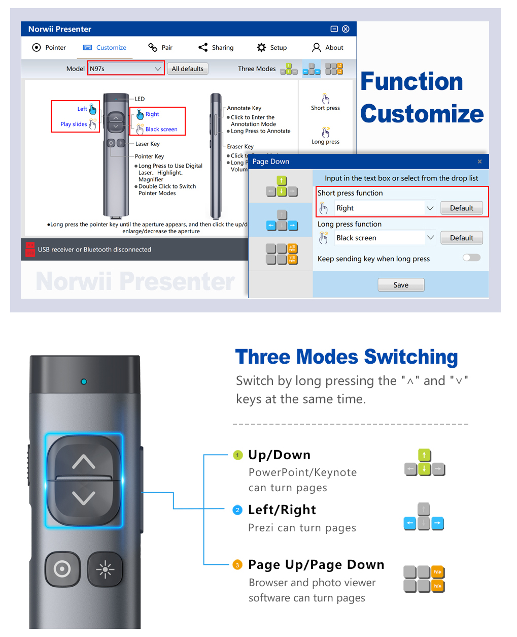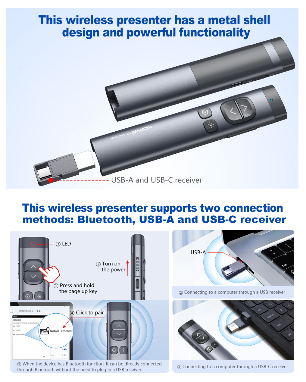 Bút trình chiếu NORWii N95 Pro Spotlight cao cấp 2in1 Thông số kỹ thuật : Model : NORWii N95 Pro SPOTLIGHT Kết nối : 2.4GHz Đầu USB 2in1 :thu phát Wireless 2.4Ghz và USB dung
