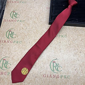 Cà vạt nam chú rể màu đỏ song Hỷ vàng tròn mẫu 6cm dây kéo thắt sẵn màu đỏ tăm