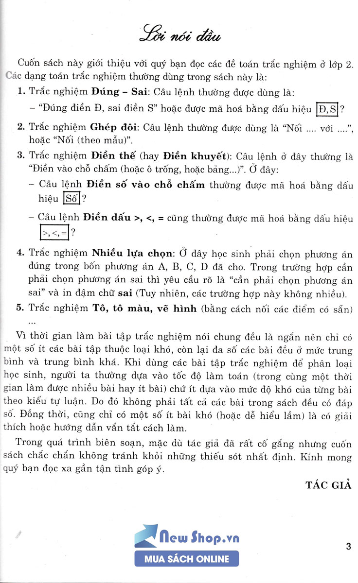 Trong công cuộc đổi mới phương pháp dạy Toán và học Toán ở Tiểu học hiện nay, thì việc tăng cường kiểm tra đánh giá và luyện tập rèn luyện kĩ nàng thông qua các dạng Toán trắc nghiệm đóng vai trò rất quan trọng. Thông thường, ở môn Toán người ta thường dùng các loại Toán trắc nghiệm sau :