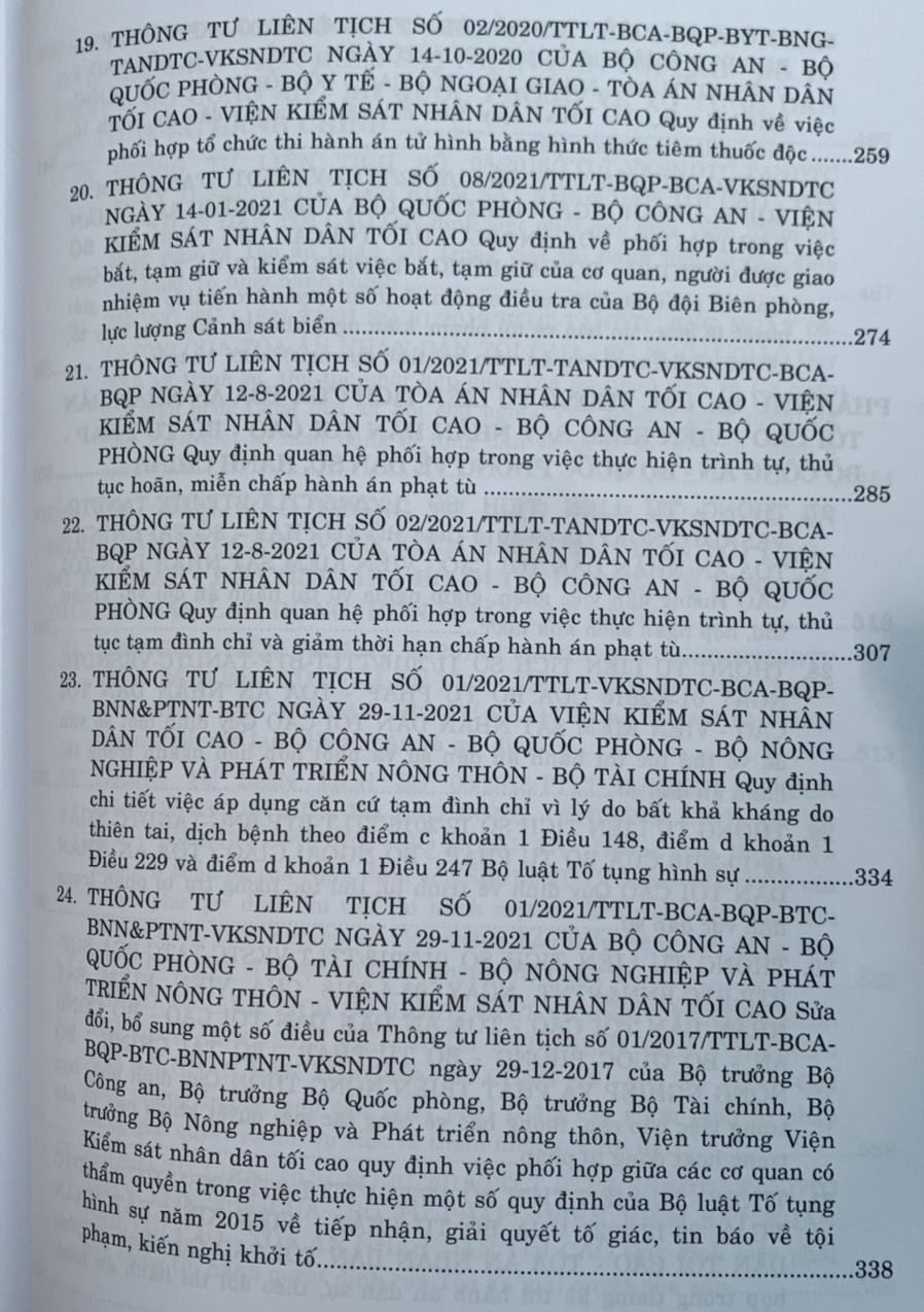 Các thông tư liên tịch của Tòa án nhân dân tối cao - Viện kiểm sát nhân dân tối cao - Bộ tư pháp - Bộ công an - Bộ quốc phòng về hình sự, tố tụng hình sự, dân sự, tố tụng dân sự, hành chính, kinh tế, thương mại, lao động, hôn nhân gia đình mới nhất Nhà xuất bản: Thông tin và Truyền thông Tác giả: TS: TRẦN VĂN HÀ (Biên soạn) Số trang: 552 trang  Kích thước: 19x27 cm    Hình thức bìa: Bìa mềm Năm xuất bản: Tháng 04/2023  Lời giới thiệu: Thời gian qua, Tòa án nhân dân tối cao, Viện kiểm sát nhân dân tối cao, Bộ Công an, Bộ Tư pháp, Bộ Quốc phòng, đã ban hành nhiều Thông tư liên tịch hướng dẫn về hình sự, tố tụng hình sự, dân sự, tố tụng dân sự, hành chính, tố tụng hành chính, lao động, kinh tế, thương mại, hôn nhân gia đình.  Nhằm kịp thời thông tin đầy đủ, chính xác và có hệ thống các Thông tư liên tịch nêu trên, Tiến sĩ Trần Văn Hà công tác tại Vụ Pháp chế và Quản lý Khoa học - Tòa án nhân dân tối cao đã biên soạn cuốn sách:  CÁC THÔNG TƯ LIÊN TỊCH CỦA TÒA ÁN NHÂN DÂN TỐI CAO - VIỆN KIỂM SÁT NHÂN DÂN TỐI CAO - BỘ TƯ PHÁP - BỘ CÔNG AN - BỘ QUỐC PHÒNG VỀ HÌNH SỰ, TỐ TỤNG HÌNH SỰ, DÂN SỰ, TỐ TỤNG DÂN SỰ, HÀNH CHÍNH, KINH TẾ, THƯƠNG MẠI, LAO ĐỘNG, HÔN NHÂN GIA ĐÌNH MỚI NHẤT Nội dung cuốn sách gồm các phần chính sau đây: Phần thứ nhất: Các Thông tư liên tịch của Tòa án nhân dân tối cao - Viện Kiểm sát nhân dân tối cao - Bộ Tư pháp - Bộ Công an - Bộ Quốc phòng về hình sự  Phần thứ hai: Các Thông tư liên tịch của Tòa án nhân dân tối cao - Viện Kiểm sát nhân dân tối cao - Bộ Tư pháp - Bộ Công an - Bộ Quốc phòng về tố tụng hình sự  Phần thứ ba: Các Thông tư liên tịch của Tòa án nhân dân tối cao - Viện Kiểm sát nhân dân tối cao - Bộ Tư pháp - Bộ Công an - Bộ Quốc phòng về dân sự, hành chính  Phần thứ tư: Các Thông tư liên tịch của Tòa án nhân dân tối cao - Viện Kiểm sát nhân dân tối cao - Bộ Tư pháp - Bộ Công an - Bộ Quốc phòng về tố tụng dân sự, tố tụng hành chính Phần thứ năm: Các Thông tư liên tịch của Tòa án nhân dân tối cao - Viện Kiểm sát nhân dân tối cao - Bộ Tư pháp - Bộ Công an - Bộ Quốc phòng về kinh tế, thương mại, lao động, hôn nhân gia đình  Hy vọng rằng đây sẽ là tài liệu hữu ích để bạn đọc, đặc biệt là các thẩm phán, hội thẩm, kiểm sát viên, điều tra viên, các học viên tư pháp, luật sư và những người làm công tác pháp luật nghiên cứu, áp dụng trong thực tiễn xét xử.  Trân trọng giới thiệu cuốn sách đến bạn đọc.