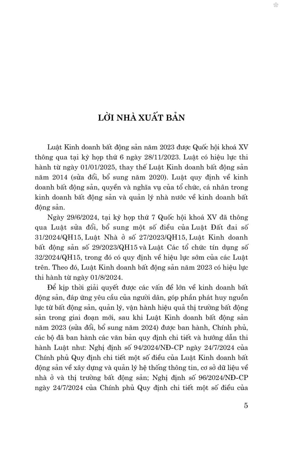 Nhằm giúp bạn đọc trong việc tìm hiểu và thực hiện pháp luật về kinh doanh bất động sản, Nhà xuất bản Chính trị quốc gia Sự thật xuất bản cuốn sách Các văn bản hướng dẫn thi hành Luật Kinh doanh bất động sản năm 2023 (sửa đổi, bổ sung năm 2024).
