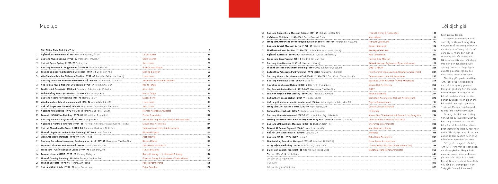 Qua hơn năm mươi công trình kiến trúc tiêu biểu, được thiết kế bởi những bậc thầy của kiến trúc hiện đại và được trình bày trong từng chương của cuốn sách này, chúng tôi luôn cảm nhận được sự kêu gọi khám phá mối quan hệ giữa lý thuyết và thực hành trong kiến trúc. Trong việc dịch giải những yếu tố hình thức và nền tảng lý thuyết của các công trình biểu tượng này, chúng tôi mong muốn đóng góp một phần vào nỗ lực thu hẹp khoảng cách giữa thực tiễn và nguyên tắc, đem câu chuyện kiến trúc mang tính toàn cầu vào một bối cảnh dễ tiếp cận, hấp dẫn và truyền cảm hứng hơn cho độc giả Việt Nam, đặc biệt là các bạn sinh viên và các kiến trúc sư trẻ.
