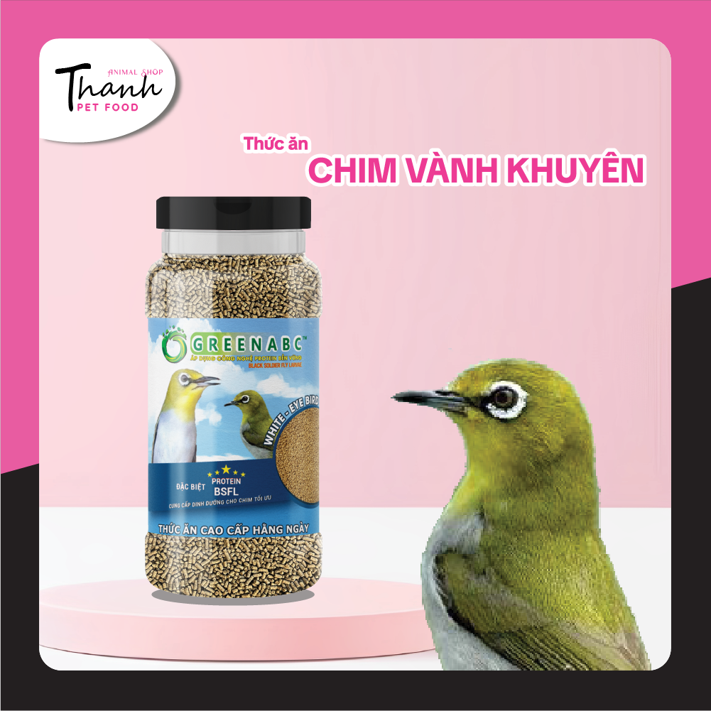 GREENABC - THỨC ĂN CHIM VÀNH KHUYÊN HÀNG NGÀY & BỔ SUNG GREENABC là thức ăn cao cấp dành cho CHIM VÀNH KHUYÊN. Đặc biệt sản phẩm GREENABC được sản xuất theo phương pháp Áp dụng công nghệ PROTEIN bền vững từ bột đạm rất giàu PROTEIN – CANXI – LIPID có trong BSFL, đã được Mỹ (AAFCO) và EU chấp nhận đưa vào công thức cho ngành sản xuất thức ăn cho vật nuôi. Sản phẩm GREENABC cung cấp các giá trị dinh dưỡng bền vững cho thú cưng, giúp cho chim:     + Kích thích vị giác, chim ăn ngon miệng hơn.     + Tiêu hóa tốt, tăng cường hấp thụ các dưỡng chất.     + Cơ thể khỏe mạnh, cân đối săn chắc, căng lửa bền lâu.     + Lông óng mượt, tăng màu sắc rực rỡ.     + Tăng cường miễn dịch, chống lại các bệnh thường gặp. Đặc biệt với thành phần G.Meal đầy đủ các dưỡng chất cần thiết giúp cơ thể phát triển toàn diện. Loại dùng hằng ngày Loại dùng bổ sunh cho chim CĂNG LỬA, LÍU BỀN, PHONG ĐỘ Thành phần dinh dưỡng và hướng dẫn sử dụng: