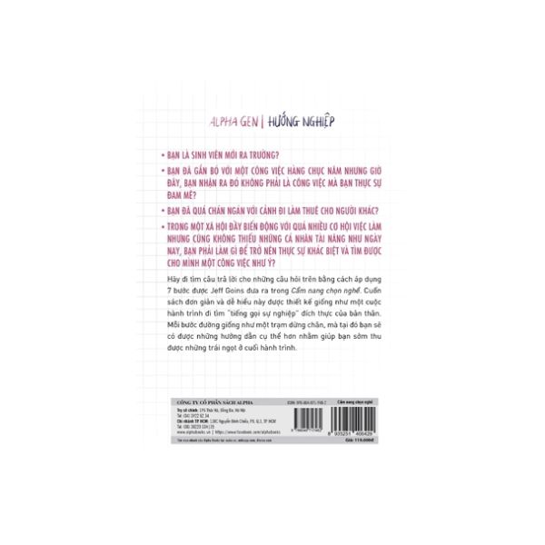 Hãy đi tìm câu trả lời cho những câu hỏi trên bằng cách áp dụng 7 bước được Jeff Goins đưa ra trong Cẩm Nang Chọn Nghề. Cuốn sách đơn giản và dễ hiểu này được thiết kế giống như một cuộc hành trình đi tìm "tiếng gọi sự nghiệp" đích thực của bản thân. Mỗi bước đường giống như một trạm dừng chân, mà tại đó bạn sẽ có được những hướng dẫn cụ thể hơn nhằm giúp bạn sớm thu được những trái ngọt ở cuối hành trình.