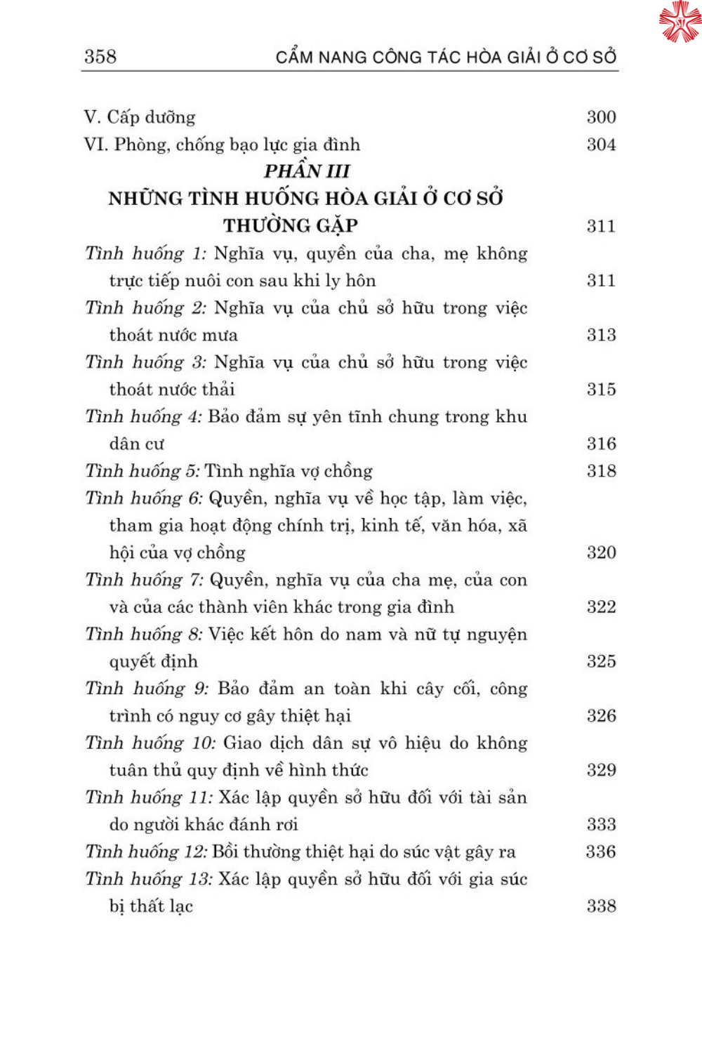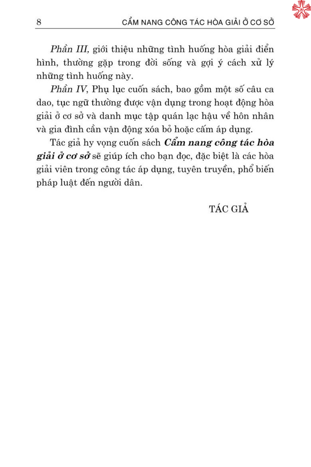 Công tác hòa giải ở cơ sở là một việc làm có ý nghĩa rất thiết thực đối với đời sống xã hội hiện nay nhằm mang lại niềm vui cho mọi người, mọi nhà, giữ gìn trật tự, an toàn xã hội, nâng cao ý thức pháp luật của người dân. Do vậy, việc các chính quyền ở cơ sở cần nắm vững những thông tin liên quan đến công tác hòa giải để giải quyết những mâu thuẫn, tranh chấp nhỏ trong nhân dân là một việc làm cần thiết. Đánh giá tầm quan trọng đó của công tác hòa giải, cuốn sách Cẩm nang công tác hòa giải ở cơ sở được xuất bản sẽ giúp chúng ta nhận thức được vấn đề đã nêu.