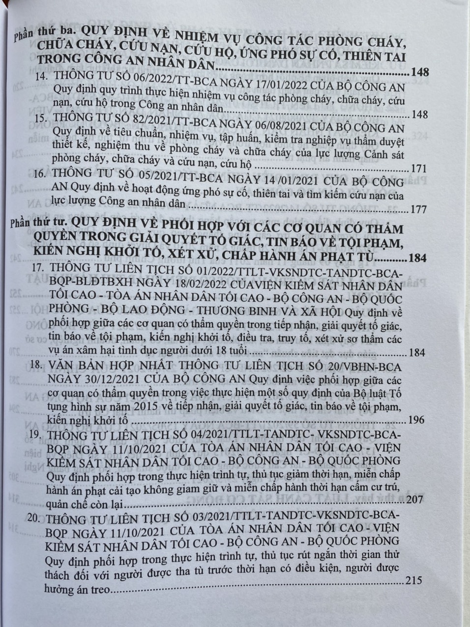 - Khổ sách: 20×28 cm ( Bìa Mềm ) Thời gian gần đây, Chính phủ, Bộ Công an đã ban hành nhiều văn bản pháp quy mới về tổ chức, hoạt động của ngành như Luật Cảnh sát cơ động số 04/2022/QH15 ngày 14/06/2022 của Quốc hội, Thông tư 23/2022/TT-BCA ngày 16/05/2022 Quy định thẩm quyền, trình tự, thủ tục giải quyết khiếu nại trong Công an nhân dân, Thông tư 19/2022/TT-BCA ngày 29/04/2022 Quy định việc tiếp nhận, phân loại, xử lý đơn khiếu nại, đơn kiến nghị, phản ánh trong Công an nhân dân, Thông tư số 06/2022/TT-BCA ngày 17/01/2022 Quy định quy trình thực hiện nhiệm vụ công tác phòng cháy, chữa cháy, cứu nạn, cứu hộ trong Công an nhân dân, Nghị định 144/2021/NĐ-CP ngày 31/12/2021 Quy định xử phạt vi phạm hành chính trong lĩnh vực an ninh, trật tự, an toàn xã hội; phòng, chống tệ nạn xã hội; phòng cháy, chữa cháy; cứu nạn, cứu hộ; phòng, chống bạo lực gia đình… Để giúp các cán bộ, chiến sĩ Công an nhân dân và bạn đọc thuận tiện trong việc tìm hiểu, nghiên cứu, sử dụng và thực hiện các quy định mới nhất của ngành, Nhà xuất bản Công An Nhân Dân cho xuất bản cuốn sách: ” CẨM NANG PHÁP LUẬT DÀNH CHO NGÀNH CÔNG AN NHÂN DÂN “ Cuốn sách gồm các phần chính sau: Phần thứ nhất. LUẬT CÔNG AN NHÂN DÂN VÀ VĂN BẢN HƯỚNG DẪN THI HÀNH Phần thứ hai. QUY ĐỊNH VỀ THANH TRA, GIẢI QUYẾT KHIẾU NẠI, TỐ CÁO VÀ TIẾP CÔNG DÂN TRONG CÔNG AN NHÂN DÂN Phần thứ ba. QUY ĐỊNH VỀ NHIỆM VỤ CÔNG TÁC PHÒNG CHÁY, CHỮA CHÁY, CỨU NẠN, CỨU HỘ, ỨNG PHÓ SỰ CỐ, THIÊN TAI TRONG CÔNG AN NHÂN DÂN Phần thứ tư. QUY ĐỊNH VỀ PHỐI HỢP VỚI CÁC CƠ QUAN CÓ THẨM QUYỀN TRONG GIẢI QUYẾT TỐ GIÁC, TIN BÁO VỀ TỘI PHẠM, KIẾN NGHỊ KHỞI TỐ, XÉT XỬ, CHẤP HÀNH ÁN PHẠT TÙ Phần thứ năm. QUY ĐỊNH ĐIỀU CHỈNH MỨC TRỢ CẤP HẰNG THÁNG ĐỐI VỚI CÁN BỘ CÔNG AN Phần thứ sáu. LUẬT CƯ TRÚ VÀ MỘT SỐ BIỆN PHÁP THI HÀNH LUẬT CƯ TRÚ Phần thứ bảy. LUẬT CẢNH SÁT CƠ ĐỘNG Phần thứ tám. QUY ĐỊNH XỬ PHẠT VI PHẠM HÀNH CHÍNH TRONG LĨNH VỰC AN NINH, TRẬT TỰ, AN TOÀN XÃ HỘI; PHÒNG, CHỐNG TỆ NẠN XÃ HỘI; PHÒNG CHÁY, CHỮA CHÁY; CỨU NẠN, CỨU HỘ; PHÒNG, CHỐNG BẠO LỰC GIA ĐÌNH Luatvietbook xin trân trọng giới thiệu cuốn sách đến bạn đọc!