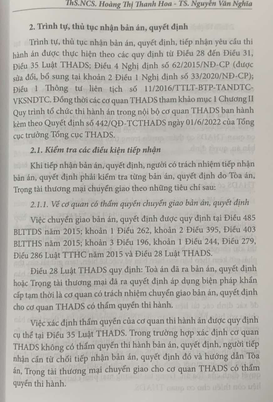 Để đáp ứng nhu cầu tra cứu nhanh, chính xác các quy định của pháp luật thi hành án dân sự và các quy định của pháp luật khác có liên quan trong quá trình tổ chức thi hành bản án, quyết định của Tòa án, đồng thời chỉ ra một số vướng mắc trong các quy định của pháp luật khi áp dụng vào các tình huống thi hành án cụ thể giúp Chấp hành viên áp dụng chính xác pháp luật, hạn chế thấp nhất sai sót có thể xảy ra, tránh thiệt hại thuộc phạm vi trách nhiệm bồi thường của Nhà nước và tránh gây thiệt hại cho các bên đương sự, Nhà xuất bản Tư pháp giới thiệu cuốn: “Cẩm nang thi hành án dân sự” (Tái bản lần thứ hai, có sửa đổi, bổ sung) của ThS.NCS. Hoàng Thị Thanh Hoa và TS. Nguyễn Văn Nghĩa.