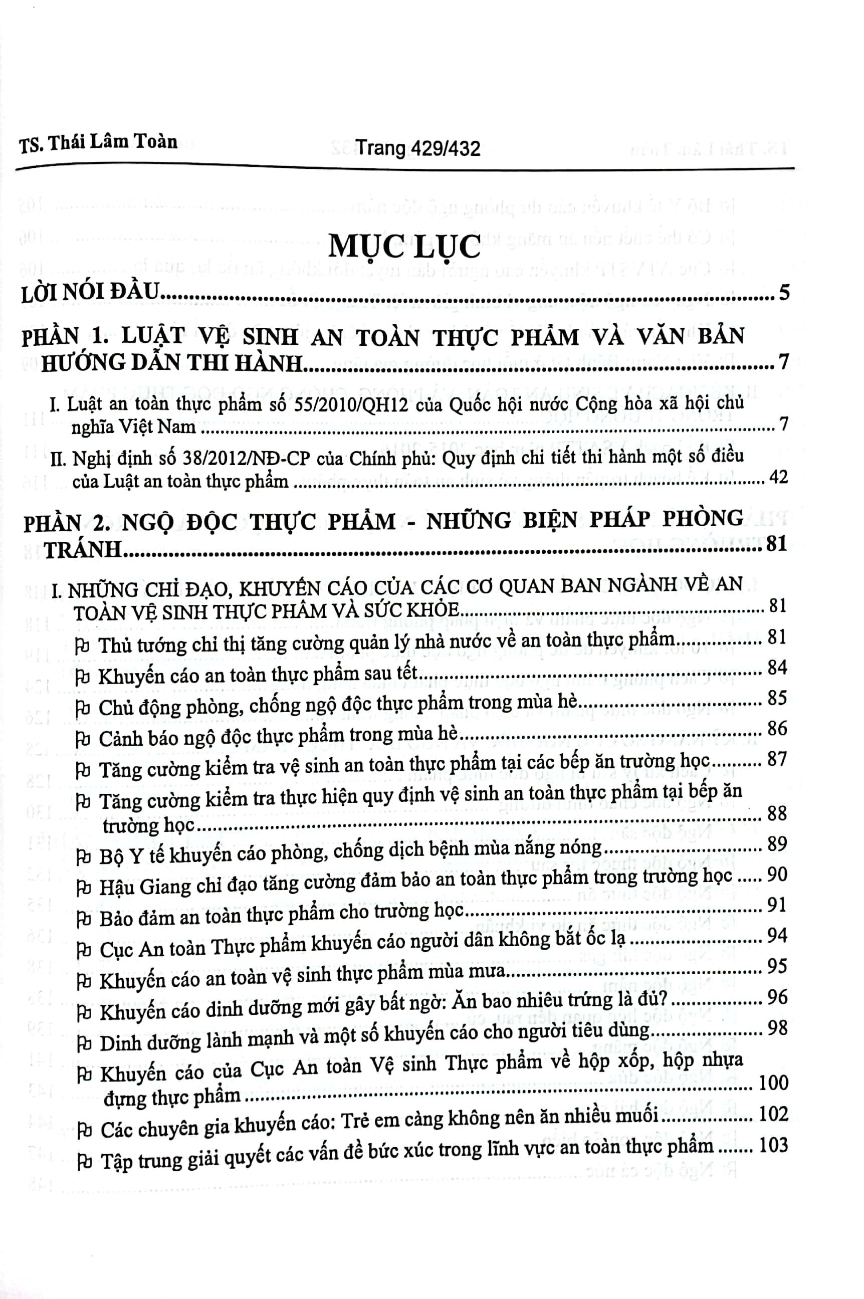 Cẩm Nang Vệ Sinh An Toàn Thực Phẩm Trong Trường Học Và Những Biện Pháp Phòng Chống Ngộ Độc Thực Phẩm Vệ sinh an toàn thực phẩm và phòng chống ngộ độc, chăm sóc sức khỏe cho mọi đối tượng học sinh trong trường học là một việc vô cùng quan trong và cần thiết đối với mọi người, bởi vì an toàn thực phẩm liên quan trực tiếp đến sức khỏe, tâm lý và tính mạng của các em những mầm non tương lai của đất nước và của mỗi gia đình. Trong những năm qua việc vệ sinh an toàn thực phẩm, phòng chống ngộ độc trong các bếp ăn tập thể, căn tin trường học… luôn được coi trọng đúng mức. Tuy nhiên, với nhiều lý do chủ quan và khách quan, hiện vẫn còn xảy ra tình trạng các em học sinh phải sử dụng thực phẩm không an toàn, có những trường hợp bị ngộ độc thực phẩm xảy ra tại các trường và những bên ăn tập thể, trong thời gian qua đang báo lên hồi chuông về an toàn vệ sinh thực phẩm không an toàn hiên nay. Để góp phần đẩy lùi và nói không với thực phẩm không an toàn, hạn chế tối đa tình trạng ngộ độc đối với học sinh trong nhà trường. Bên cạnh đó, góp phần thực hiện đầy đủ và nghiêm túc thực hiện các nội dung đảm bảo vệ sinh an toàn thực phẩm trong các cơ sở giáo dục, Nhằm mục đích chăm sóc sức khỏe ban đầu cho học sinh, sinh viên trong thời gian học tập tại trường, cũng như kịp thời tuyên truyền, phổ biến những chỉ đạo mới nhất của Nhà nước trong công tác y tế vệ sinh an toàn thực phẩm trong trường học, Nhà xuất bản Dân Trí xuất bản cuốn sách: Nội dung cuốn sách gồm những phần chính như sau: Phần 1. Luật vệ sinh an toàn thực phẩm và văn bản hướng dẫn thi hành Phần 2. Ngộ độc thực phẩm – Những biện pháp phòng tránh Phần 3. Kỹ năng sơ cứu xử lý ngộ độc thực phẩm trong trường học Phần 4. Hỏi đáp về những quy định an toàn thực phẩm và những sáng kiến kinh nghiệm về an toàn thực phẩm tại các trường học – Những thông tin hữu ích cho mọi người Phần 5. Hỏi đáp về công tác thanh tra, kiểm tra xử phạt vi phạm vệ sinh an toàn thực phẩm.