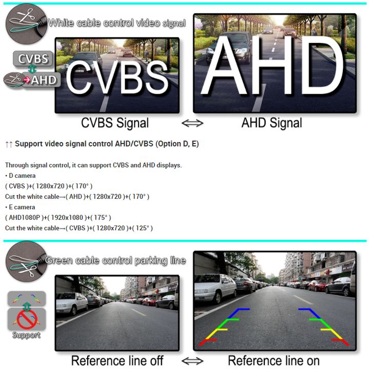 - Hình ảnh Camera oto AHD hiển thị lên màn hình có 2 chế độ. Chế độ có vạch và chế độ không có vạch lùi.